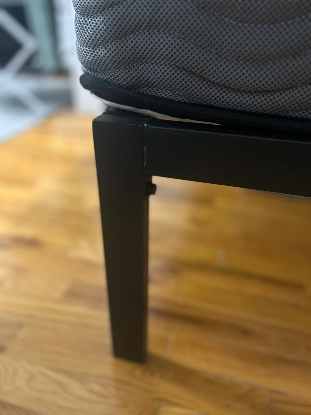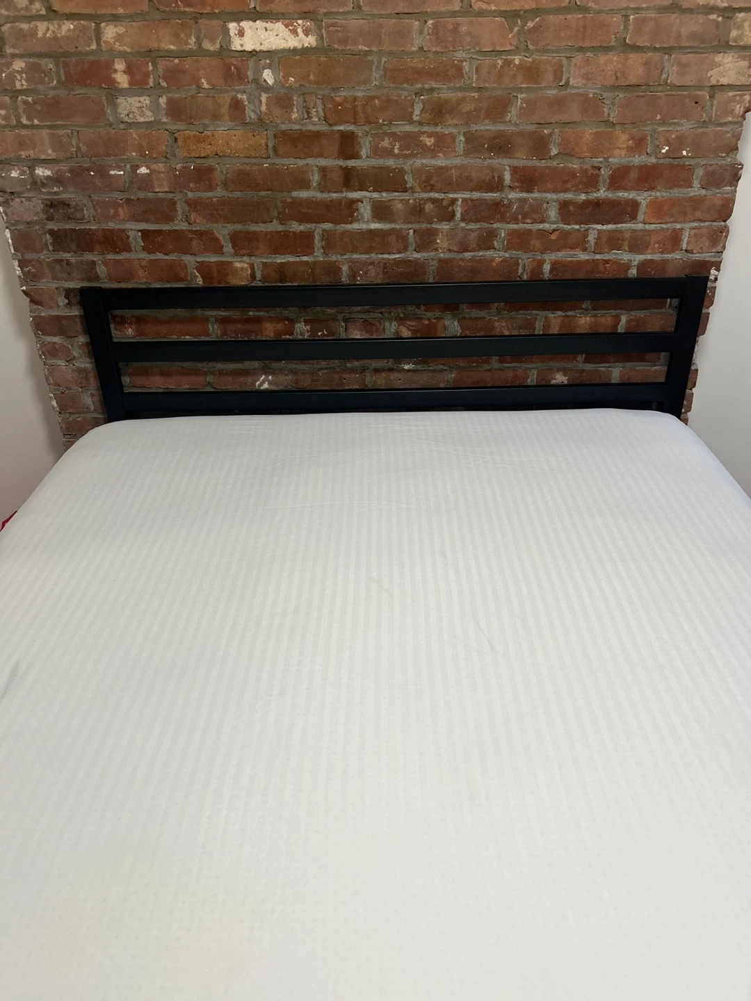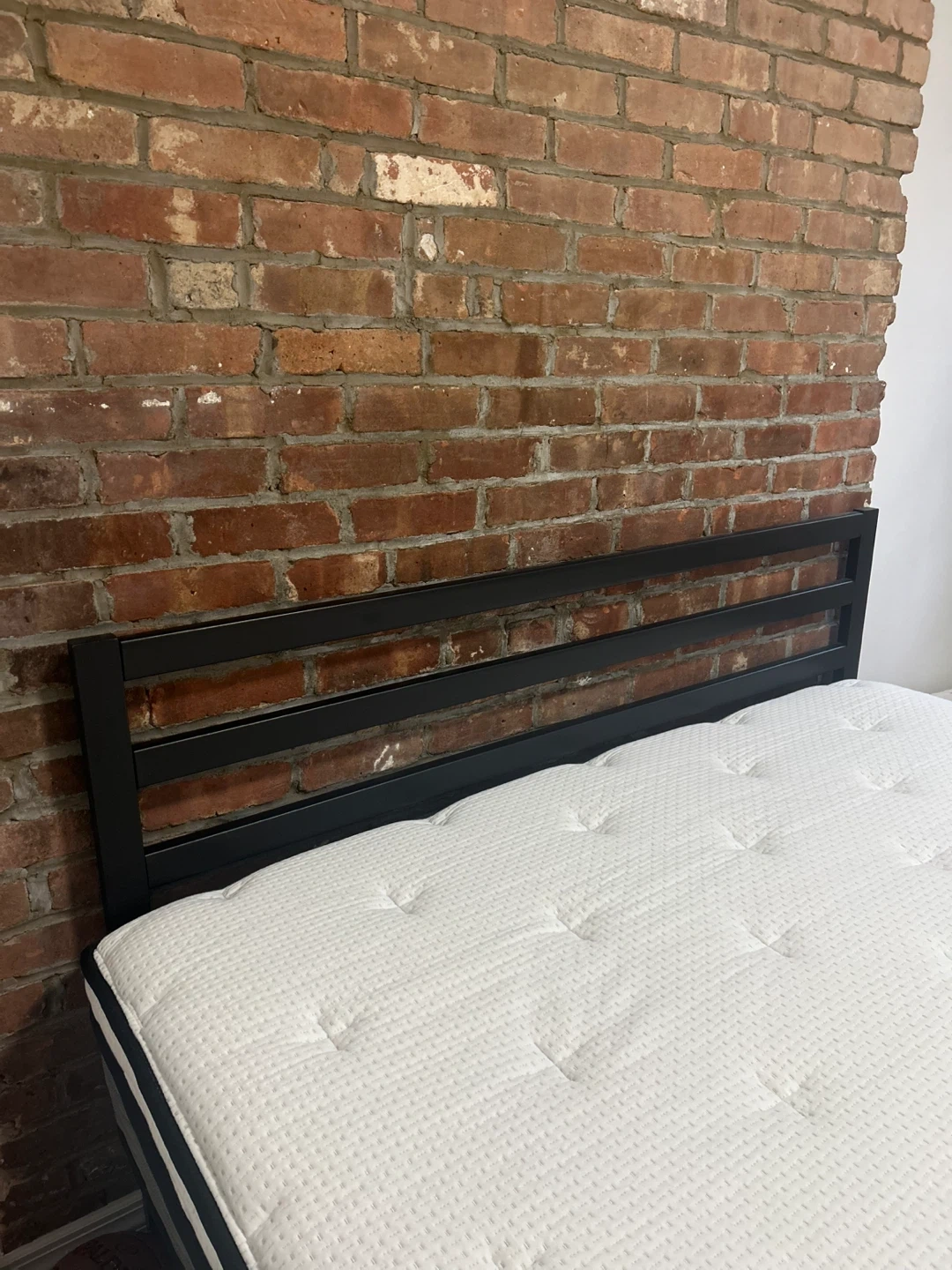 Selling a queen size mattress with a black metal bed frame. The mattress appears to be in good condition. The bed frame is also in good condition and is easy to assemble