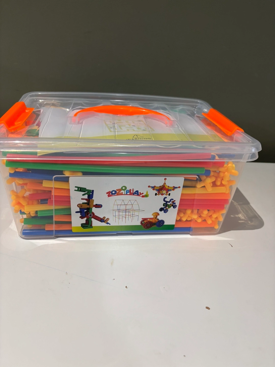 36Colorful plastic construction toy. Includes various connectors and straws. Great for imaginative play. Comes in a clear plastic storage container.