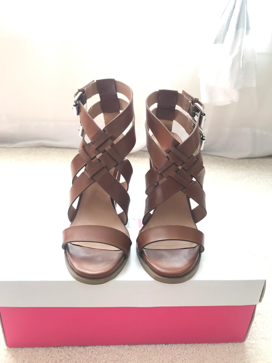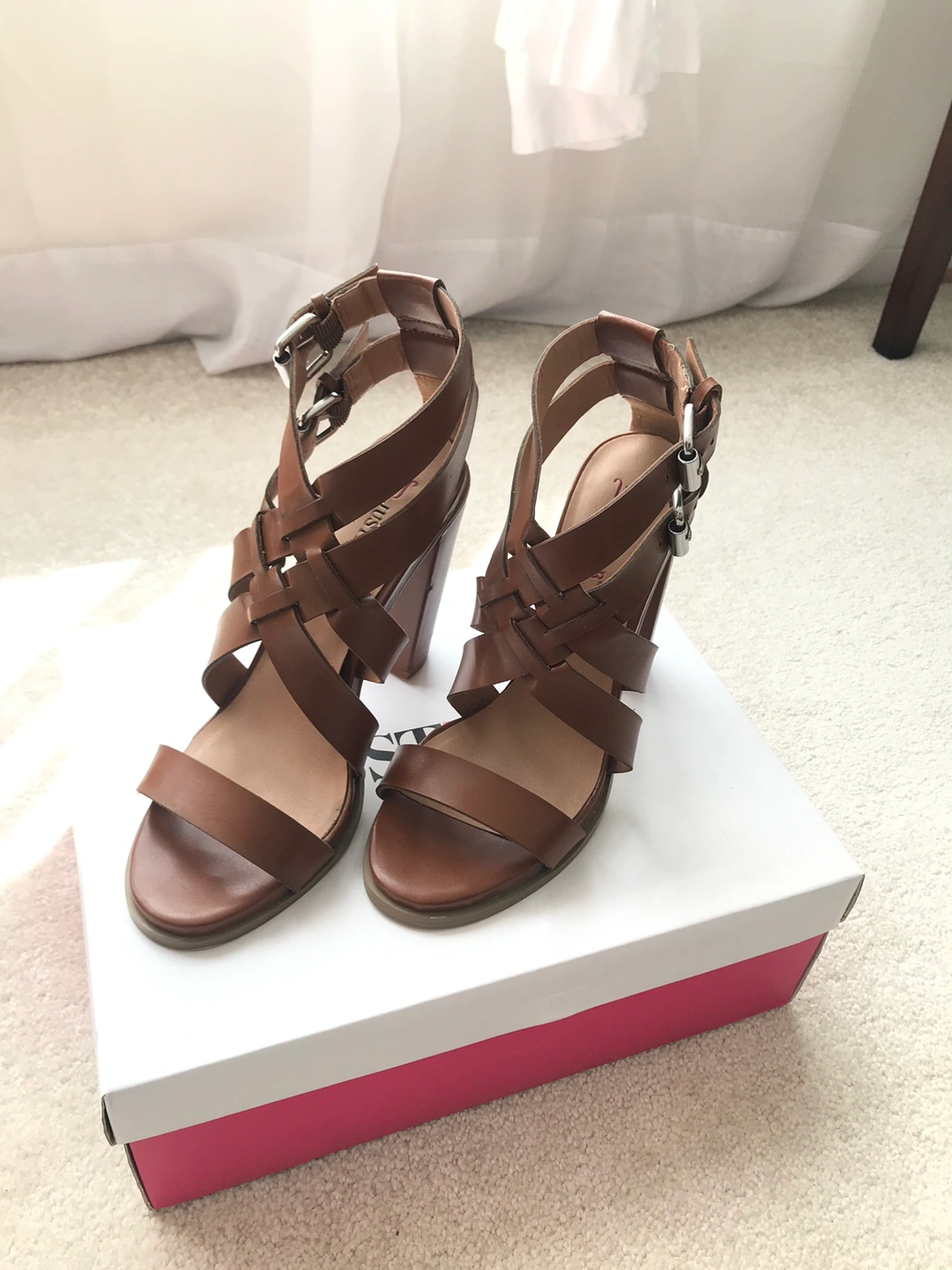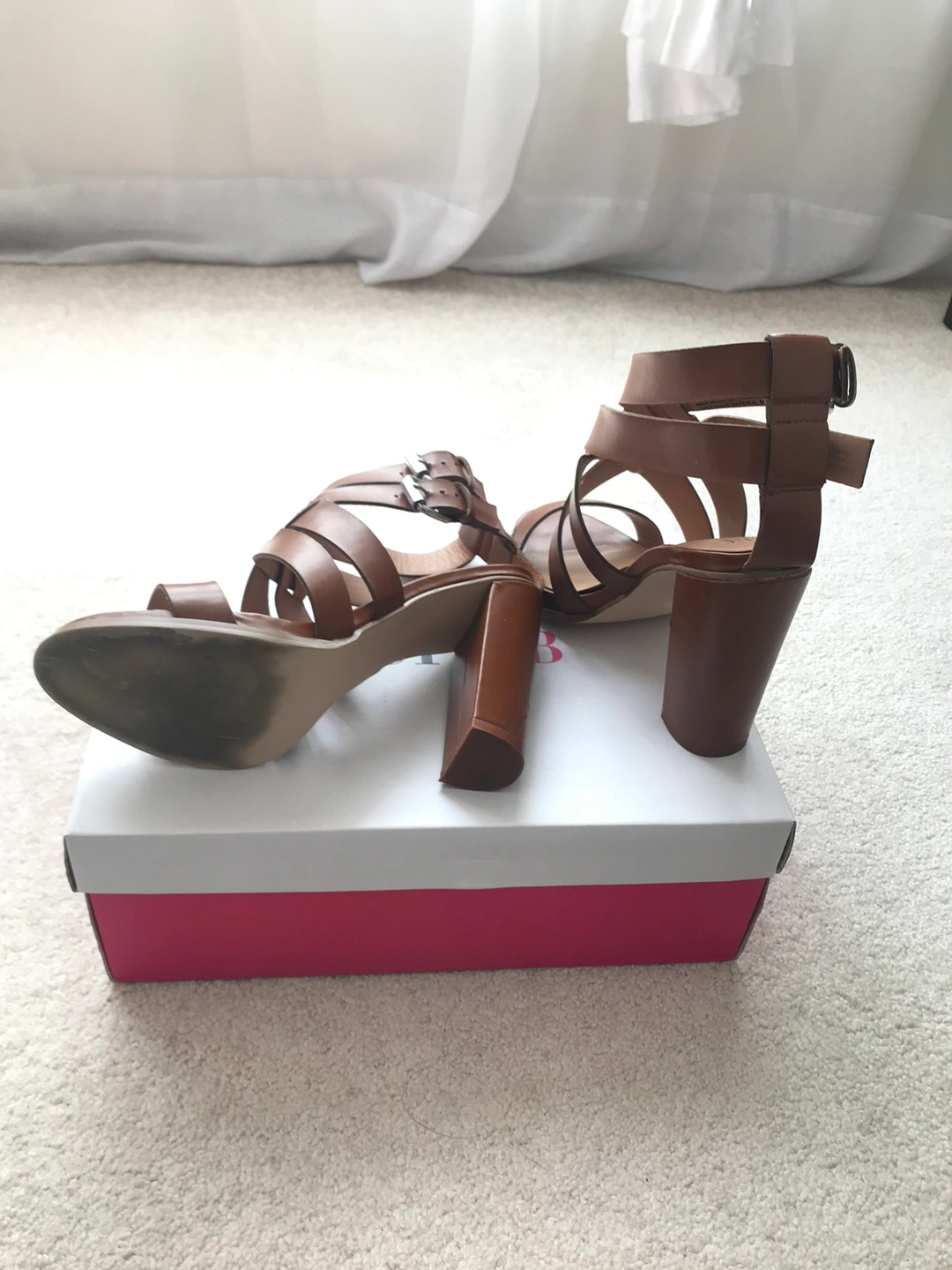 Cognac coloured heeled sandals with double buckle closure