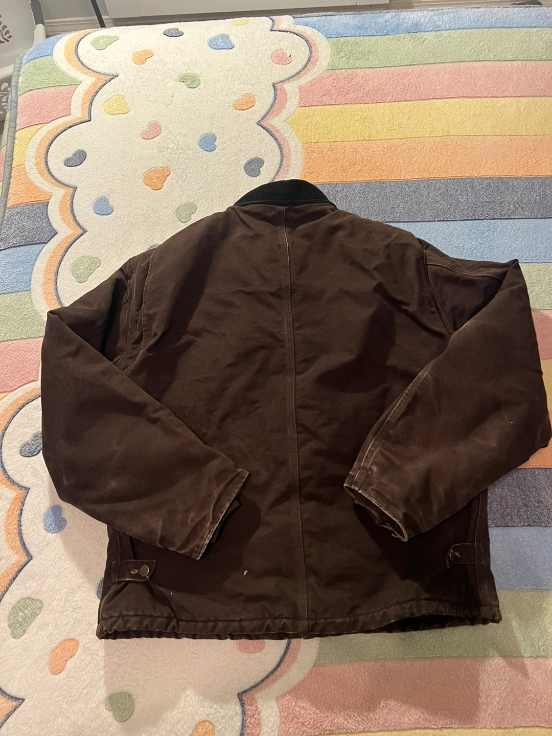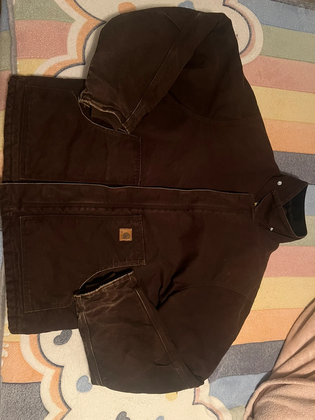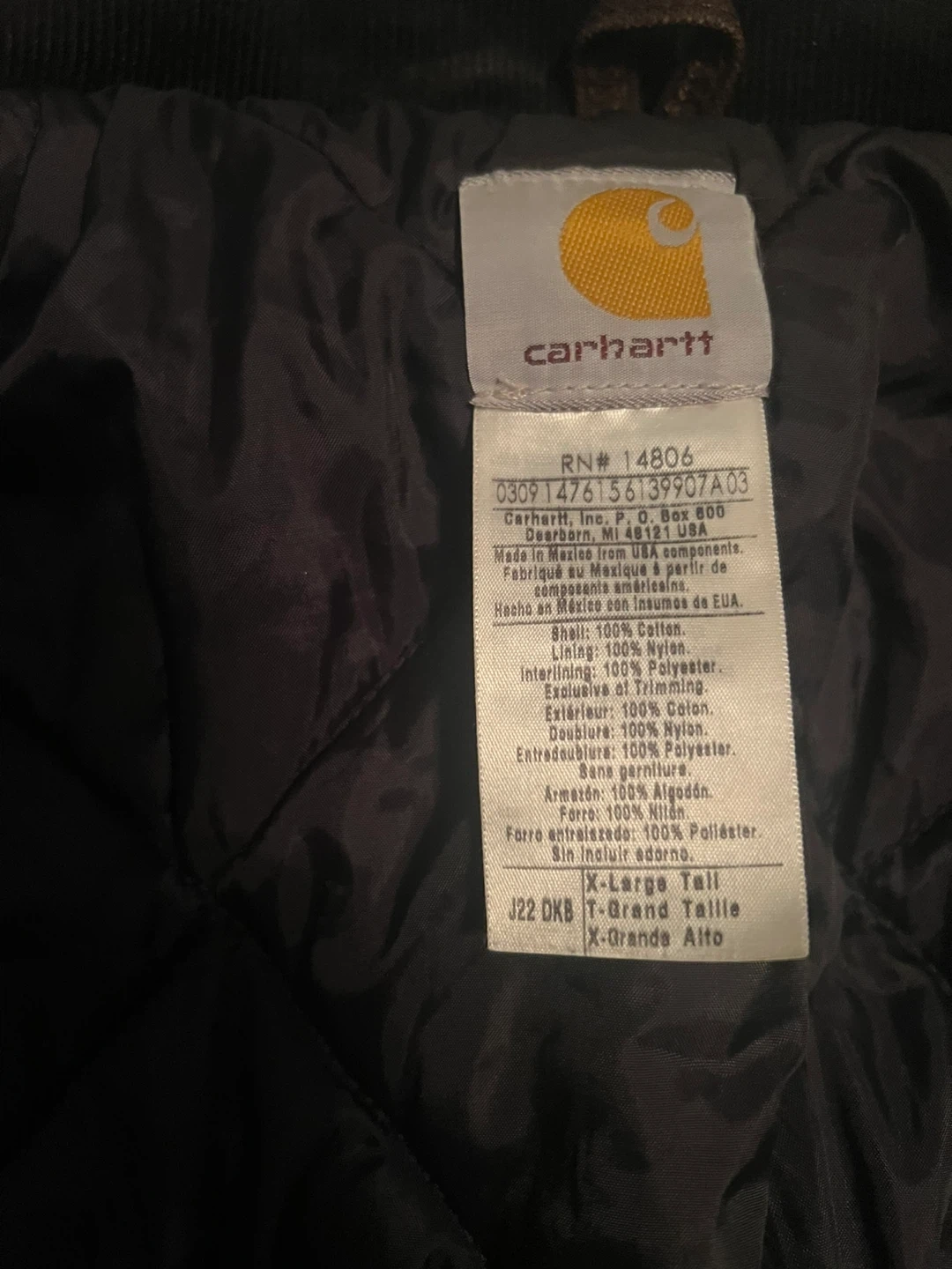 Selling a Carhartt J22 DKB jacket in size X-Large Tall. It's a durable and warm jacket, perfect for the Canadian weather! The jacket is made of 100% cotton shell with 100% nylon lining and 100% polyester interlining.