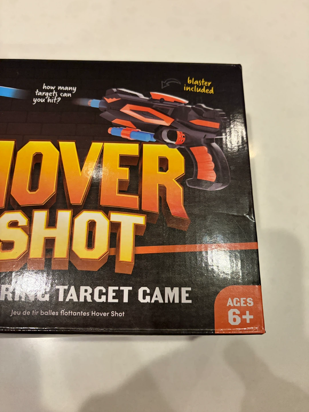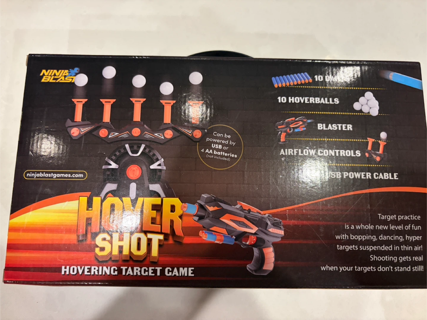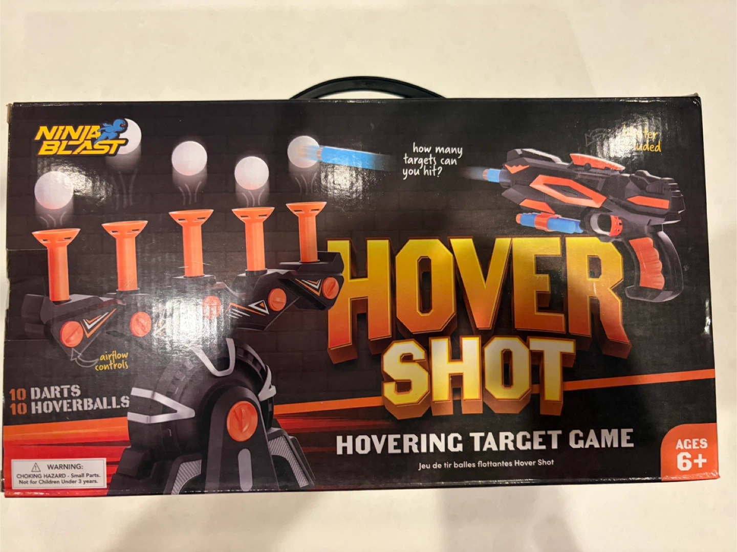This is a Ninja Blast Hover Shot hovering target game! It's suitable for ages 6 and up. It includes 10 darts and 10 hoverballs. The blaster is also included! This is a fun game for kids and adults alike.
