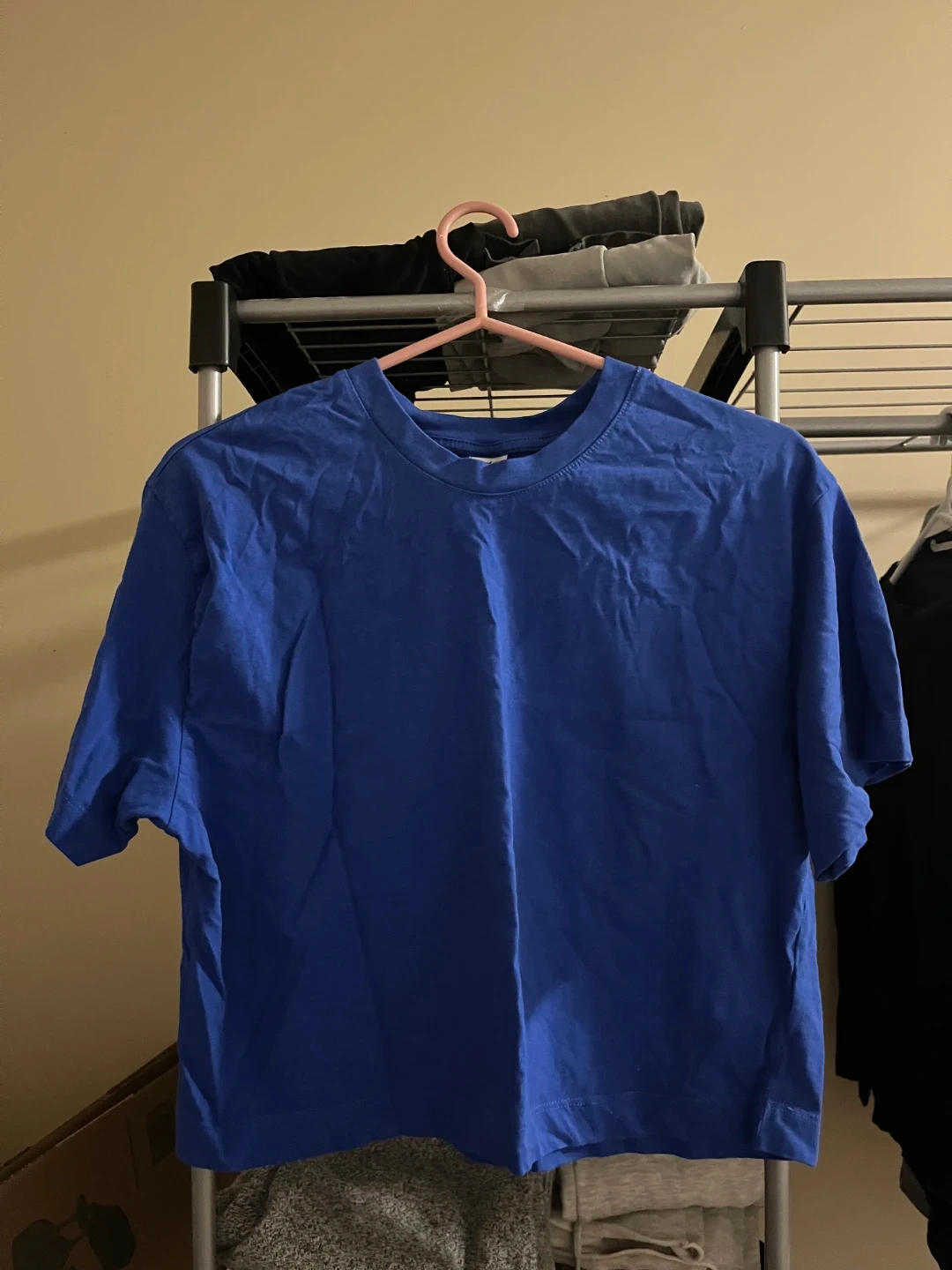 A comfy blue t-shirt with a crew neck and short sleeves. It's made from soft cotton fabric, making it a great everyday basic. Perfect for layering or wearing on its own!