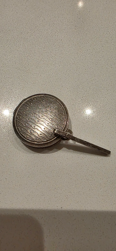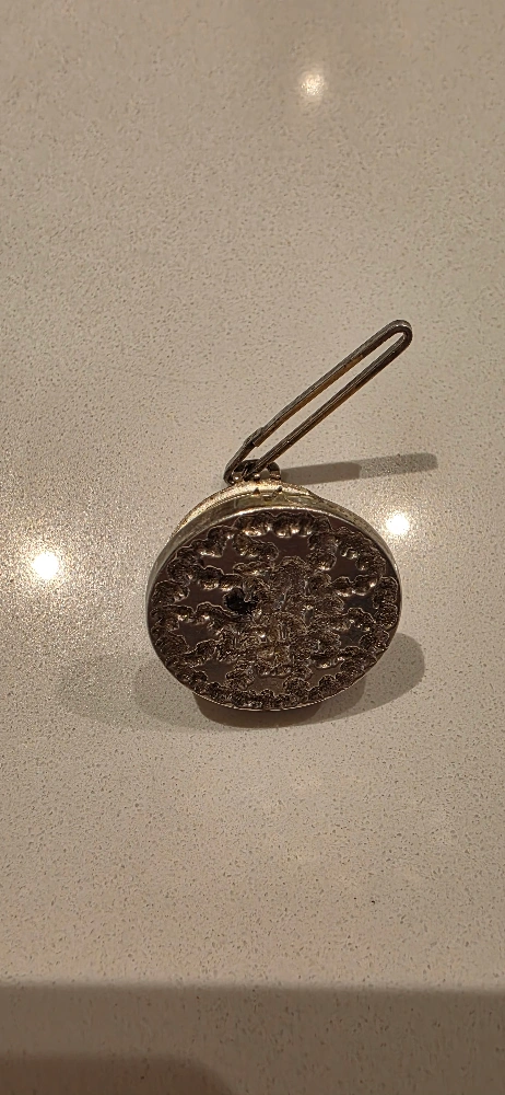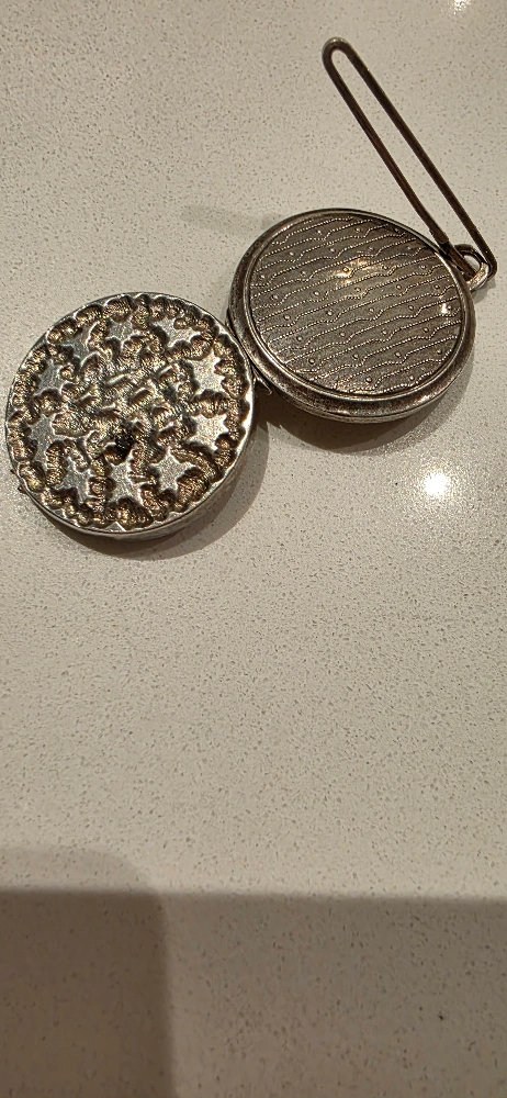 Selling a vintage solid silver compact locket! It has a unique textured design on the outside and opens to reveal a mirror on one side and a compartment for powder on the other. A charming little piece for your collection!
