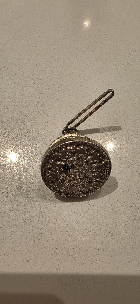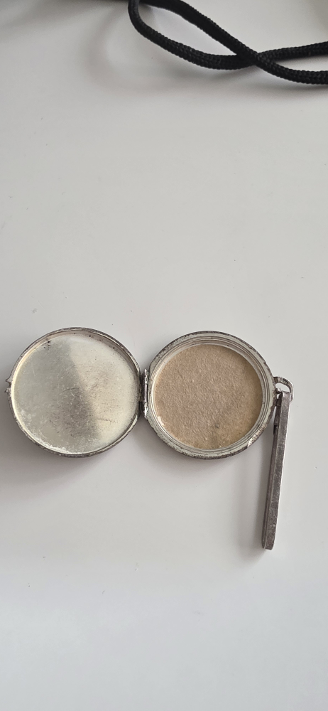 Selling a vintage solid silver compact locket! It has a unique textured design on the outside and opens to reveal a mirror on one side and a compartment for powder on the other. A charming little piece for your collection!