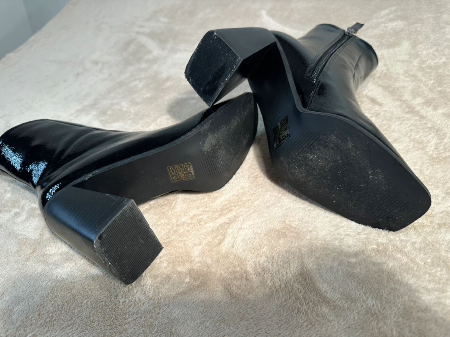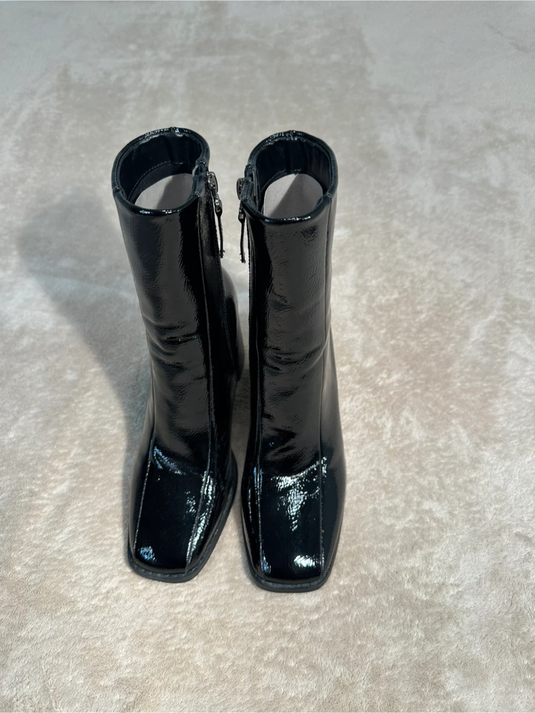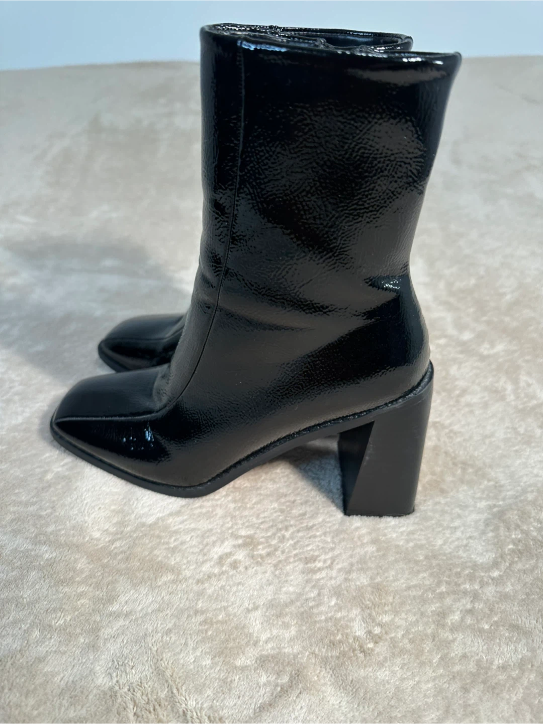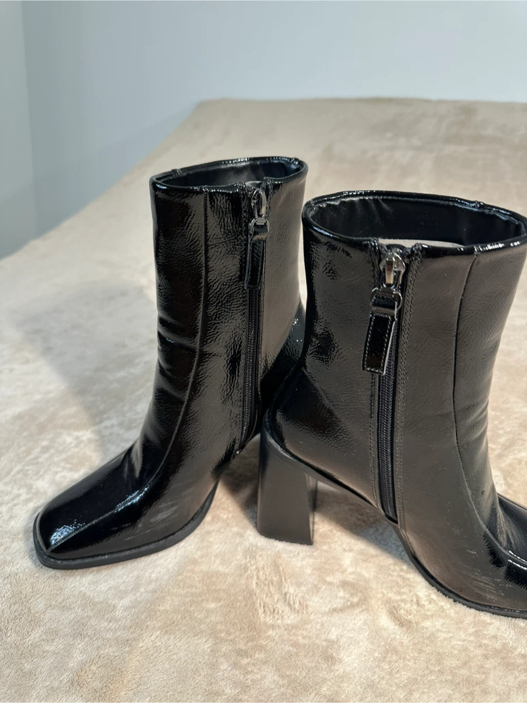 Chic black patent ankle boots with a stylish block heel. Features a side zipper for easy wear. Perfect for adding a touch of sophistication to any outfit!