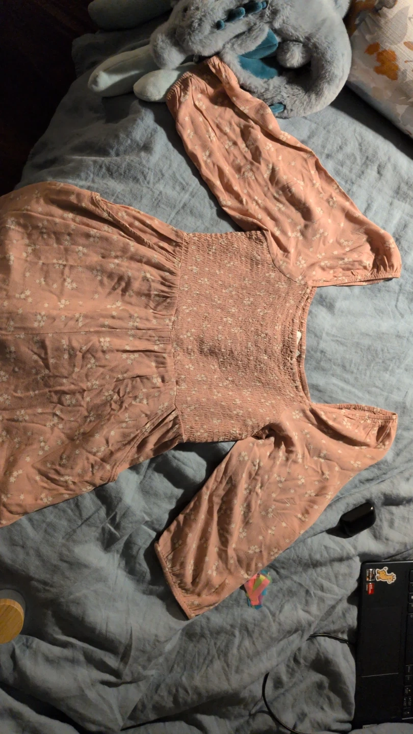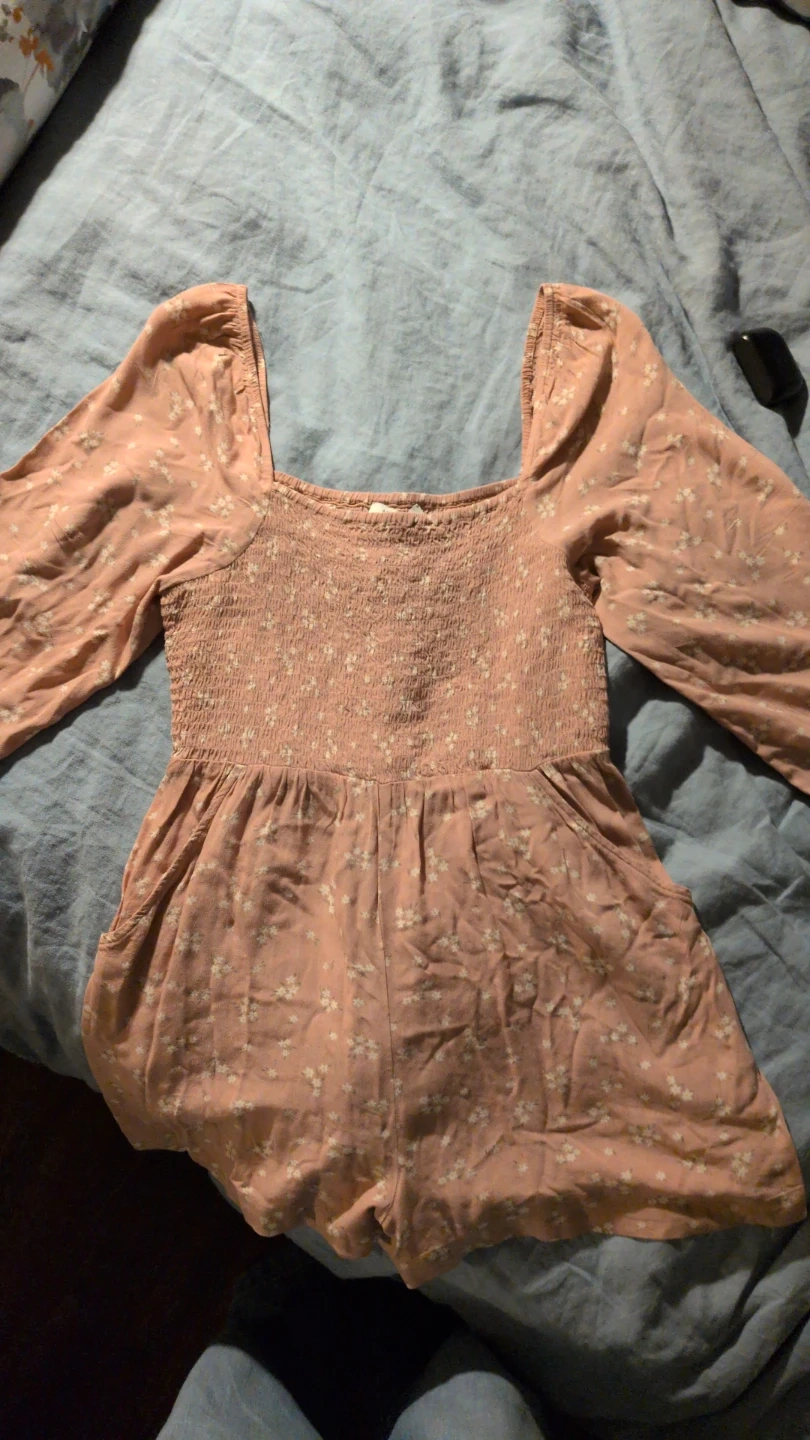 A pink smocked romper with a ditsy floral print. It features long, puffy sleeves and a square neckline. It's very stretchy, has pockets, and the skirt is shorts.