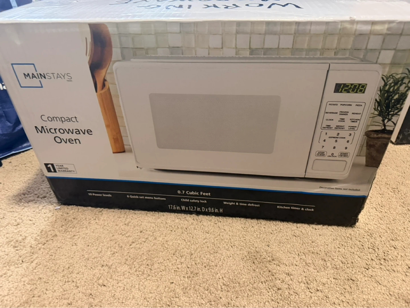 Mainstays compact microwave oven. 0.7 Cubic Feet capacity. Includes 10 power levels and child safety lock. Weight & time defrost. Kitchen timer & clock.