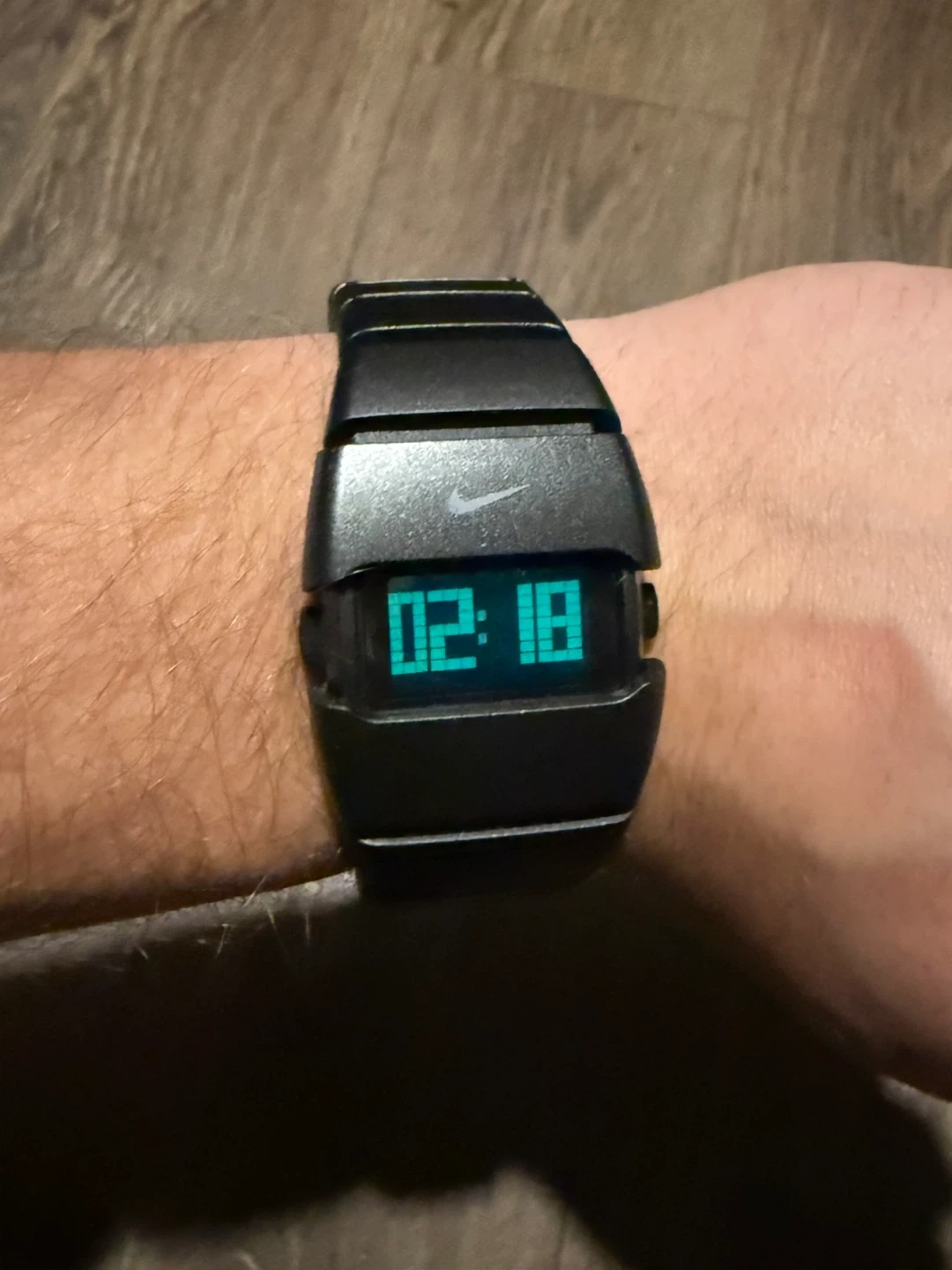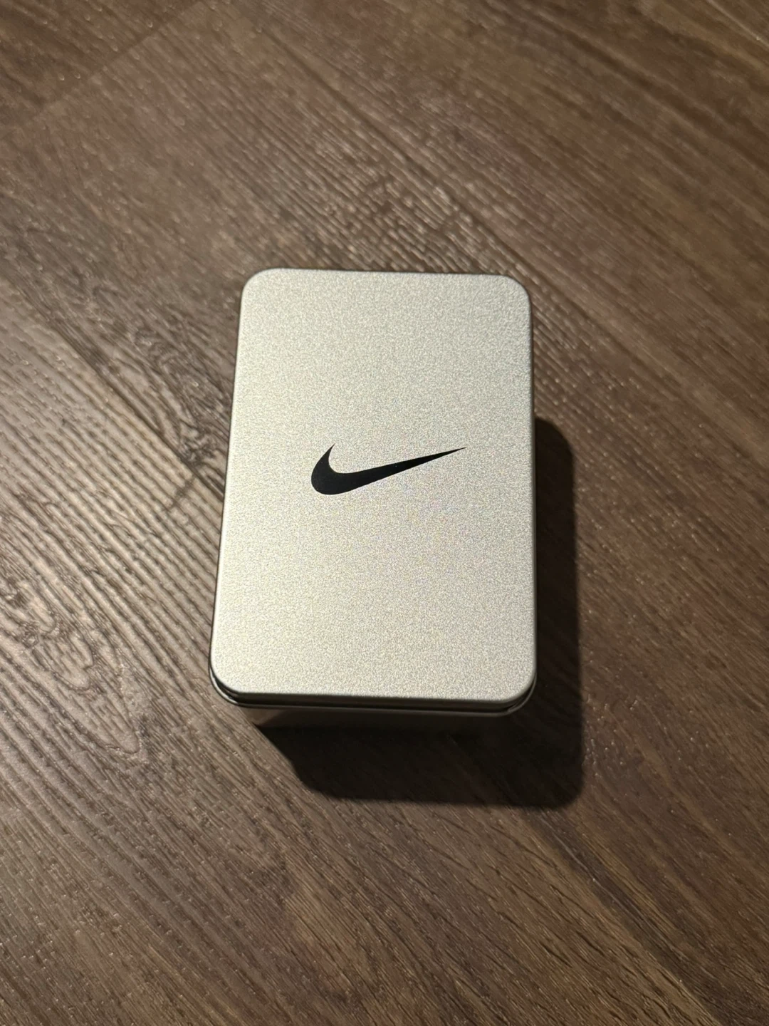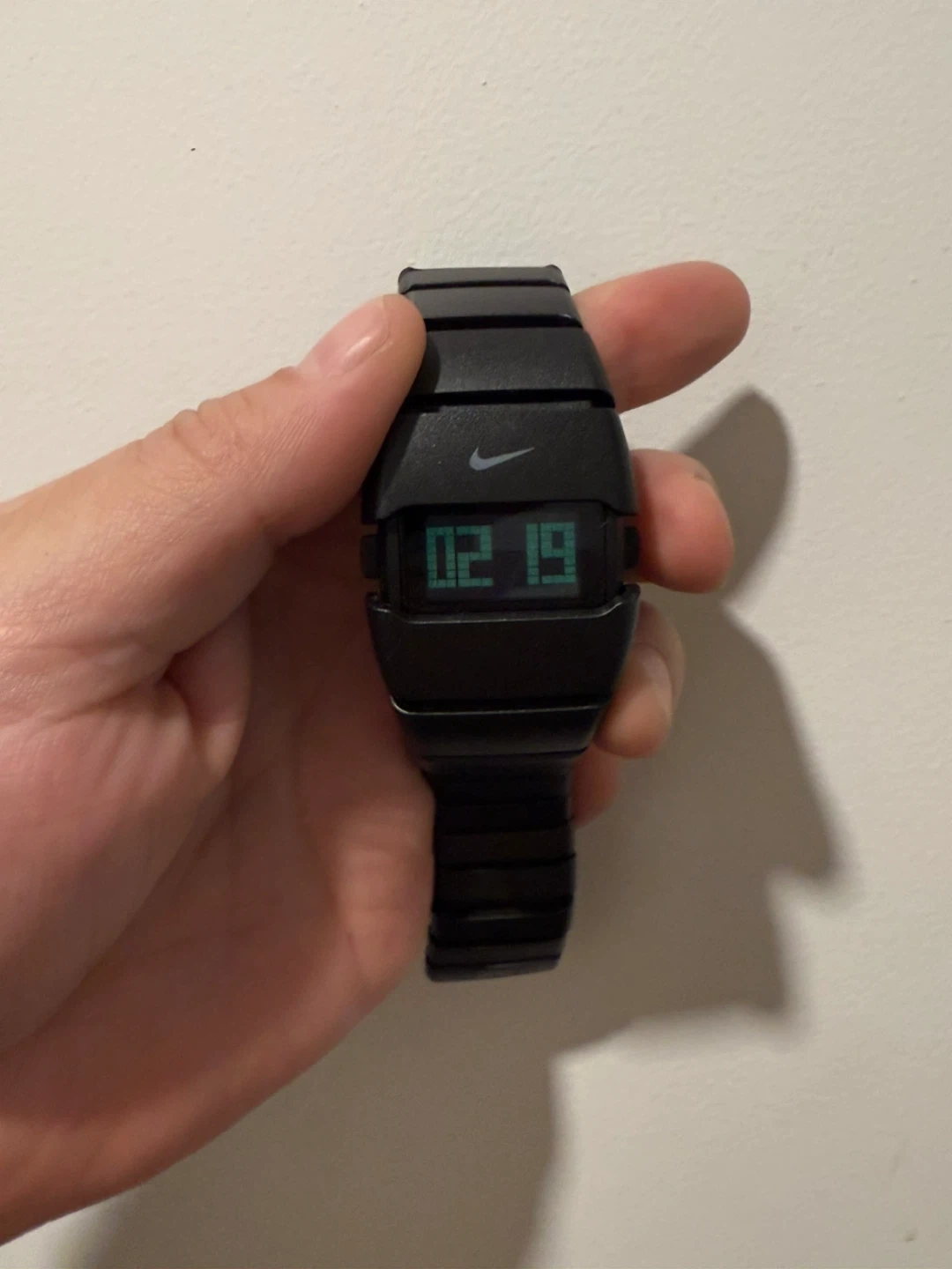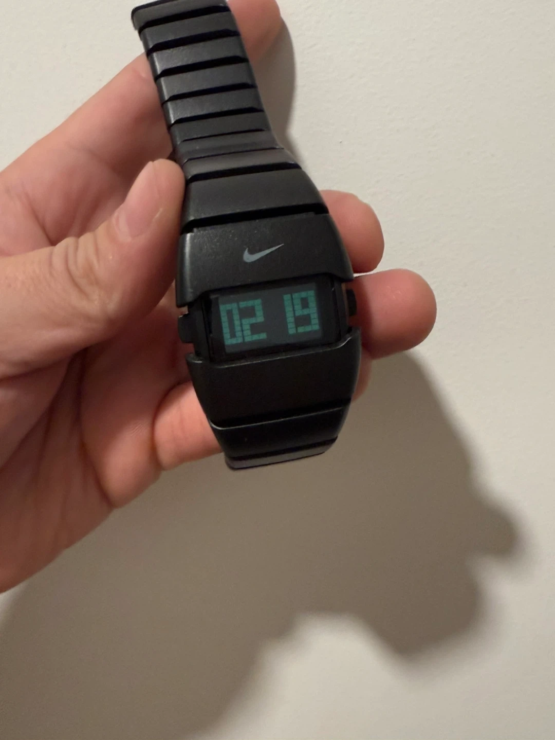 This is a black Nike digital watch. It's a digital display with a black band. Comes with its original Nike tin storage case.