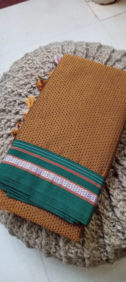 A beautiful woven saree with a rich brown base and a vibrant green border. It features intricate patterns and colourful striped pallu. Perfect for special occasions or cultural events!