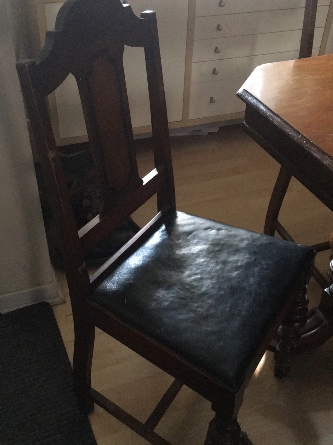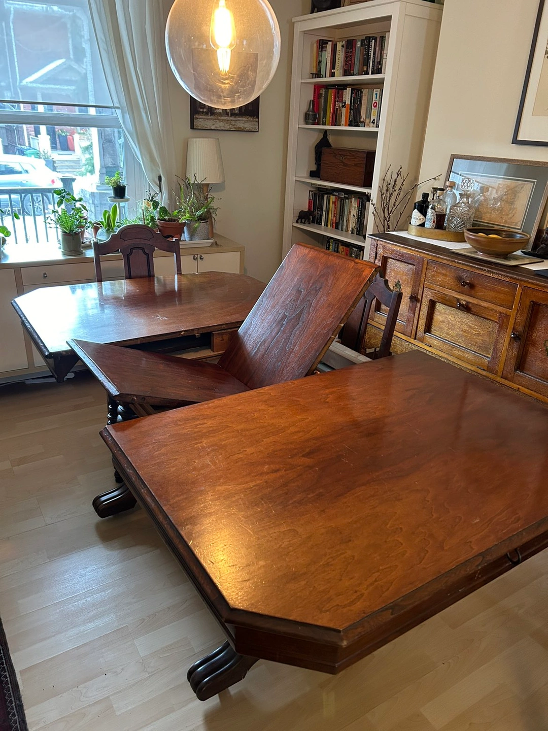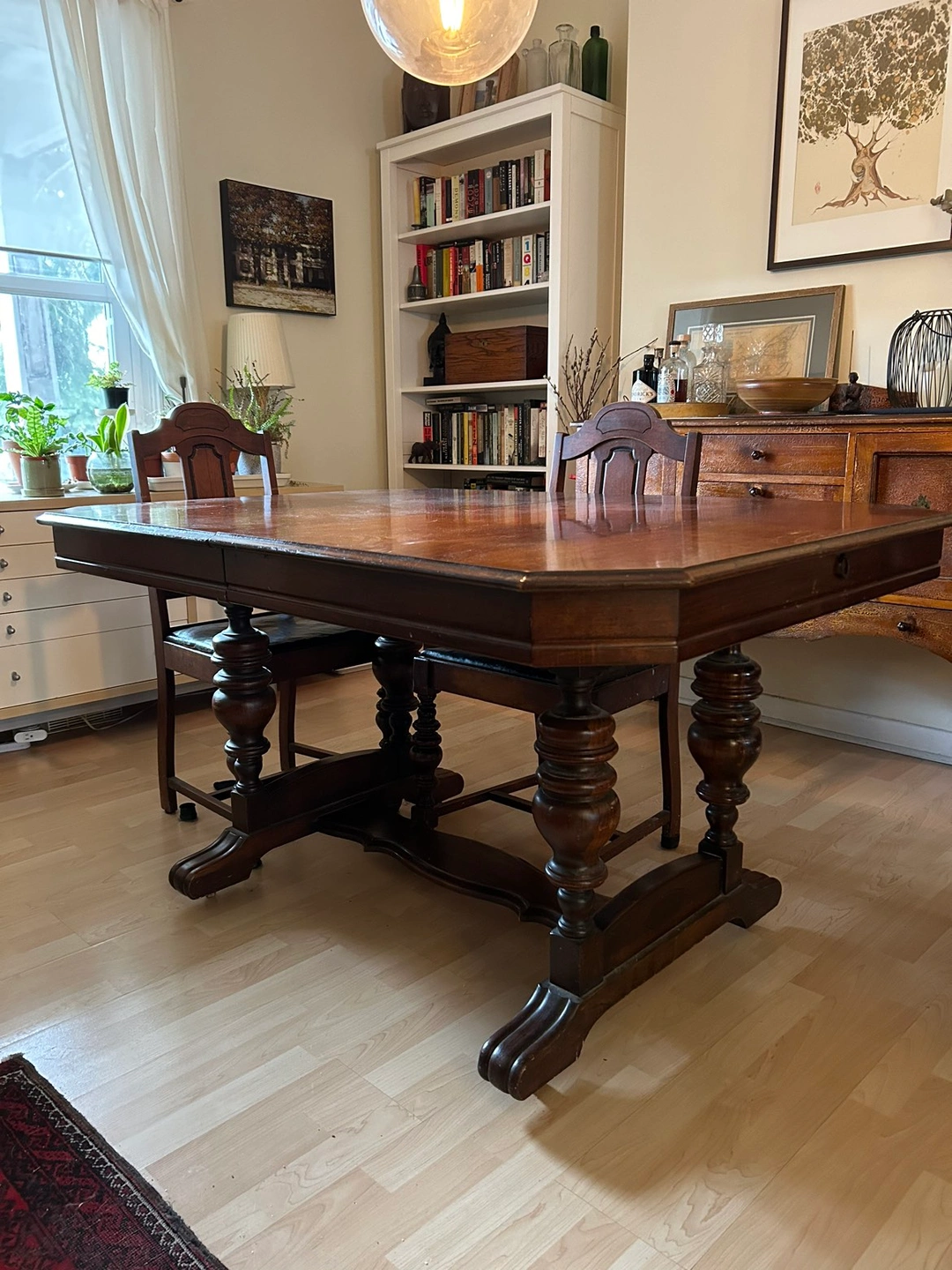 Beautiful trestle table ready for a new family. Seats 4 and extends to seat 6. 4 chairs included, one needing repair. We’re open to any offers.