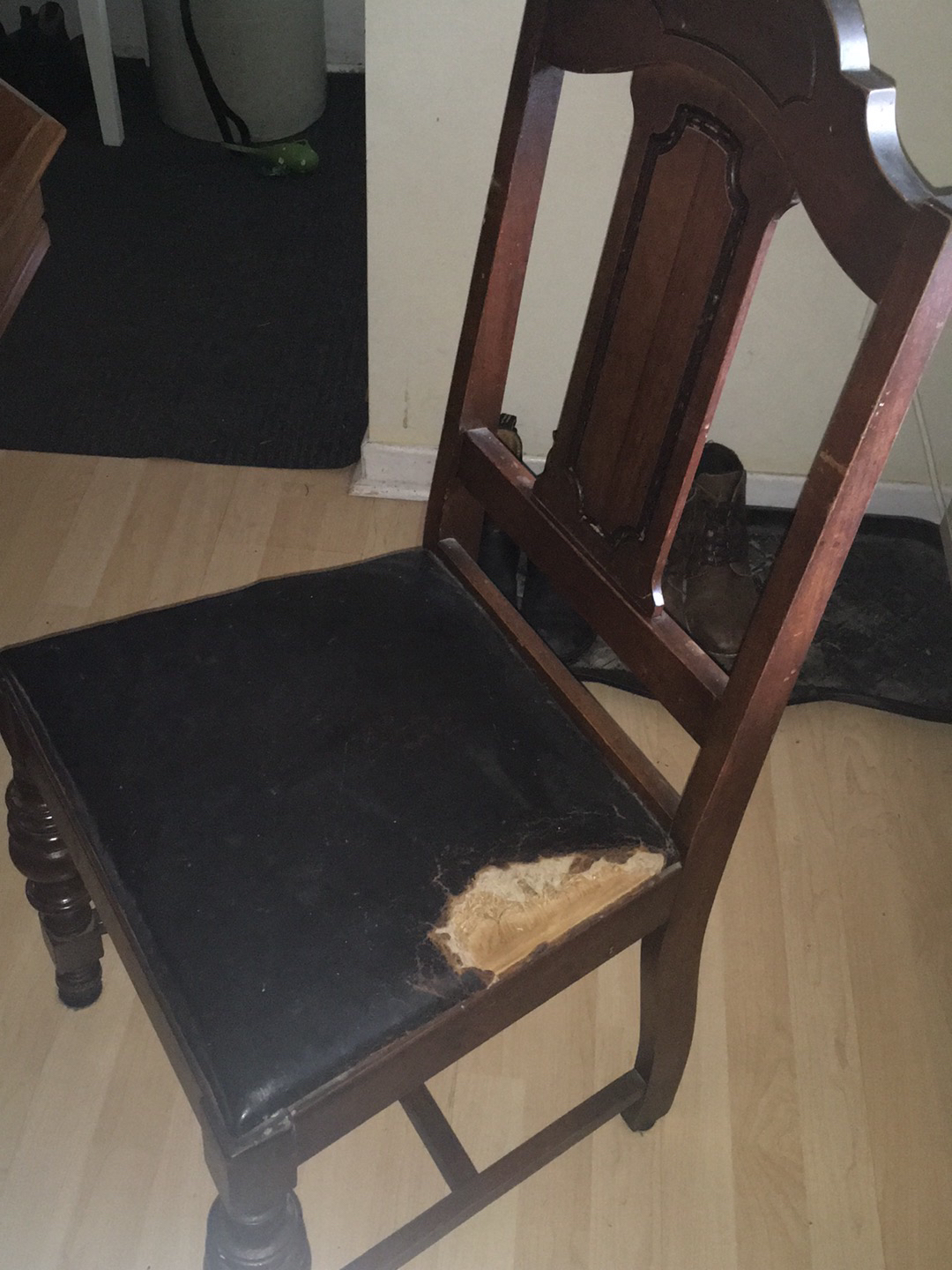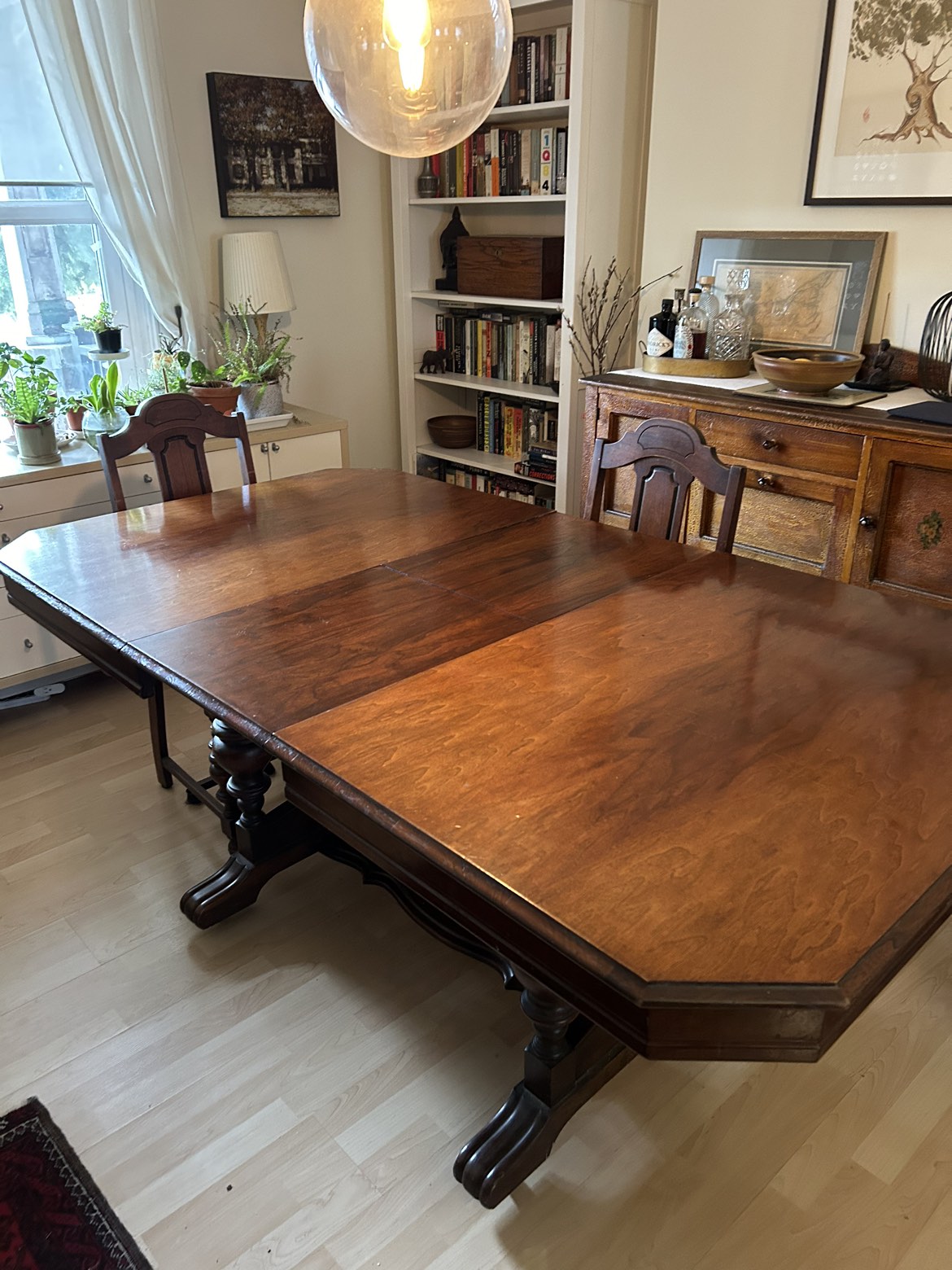 Beautiful trestle table ready for a new family. Seats 4 and extends to seat 6. 4 chairs included, one needing repair. We’re open to any offers.