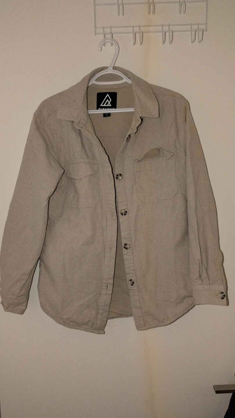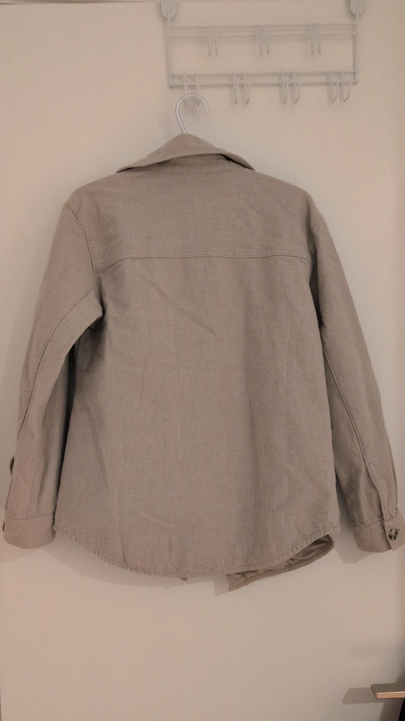 tan button-up shirt jacket. It's a size small but fits like medium medium with two chest pockets. Made from cotton-blend fabric and it's thickly layered