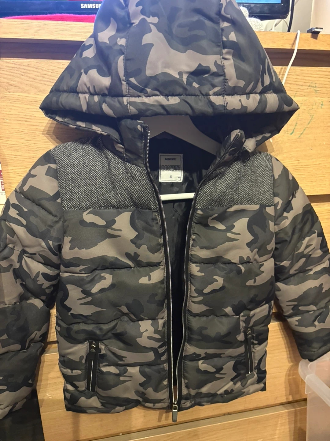 This is a kids’ winter puffer jacket with a camouflage pattern. Size: 4 years