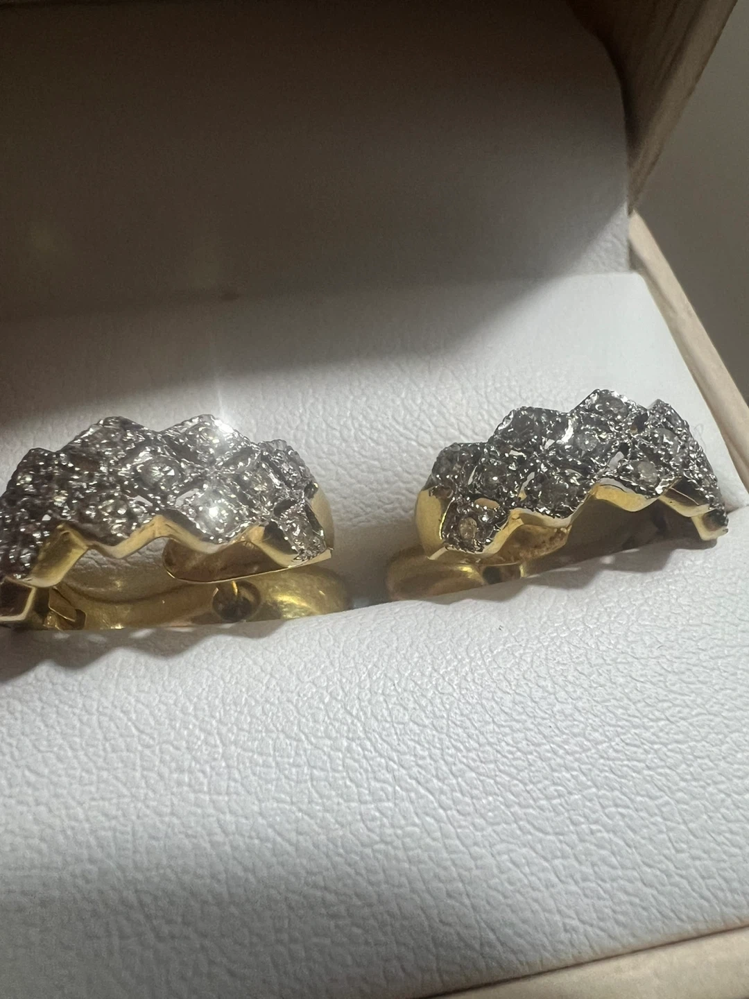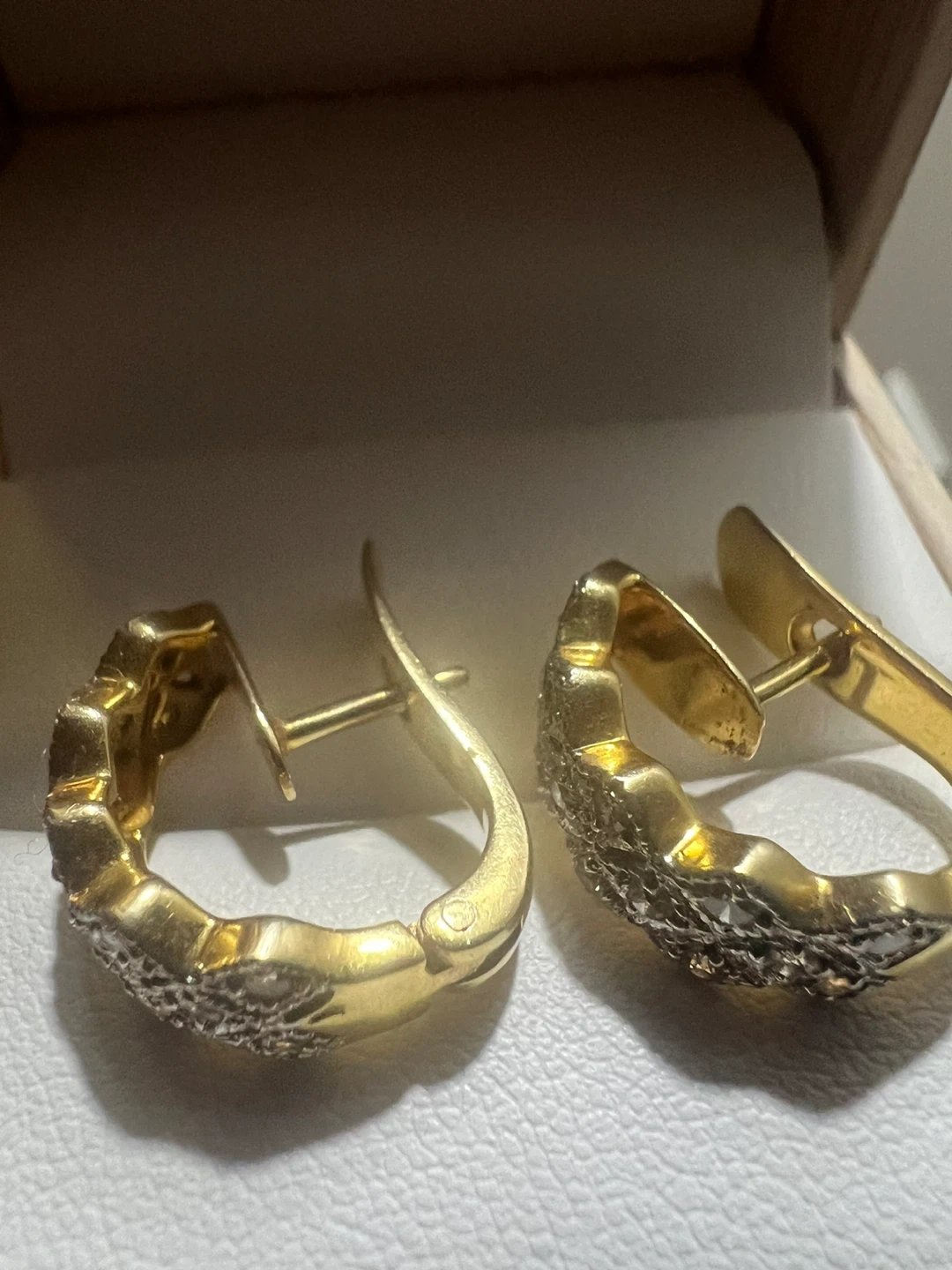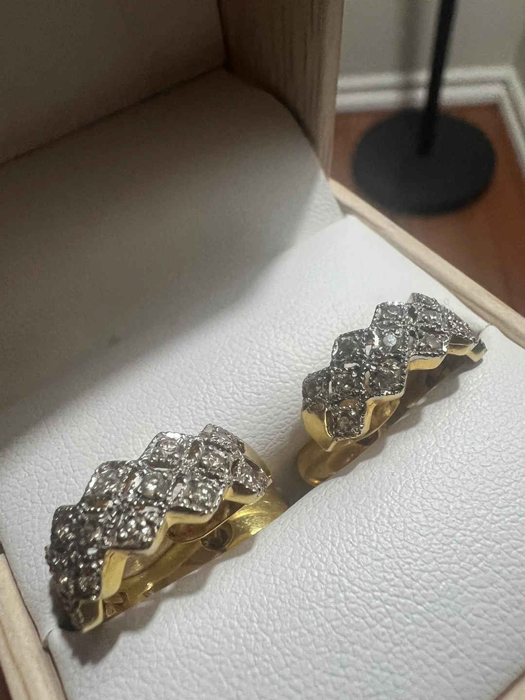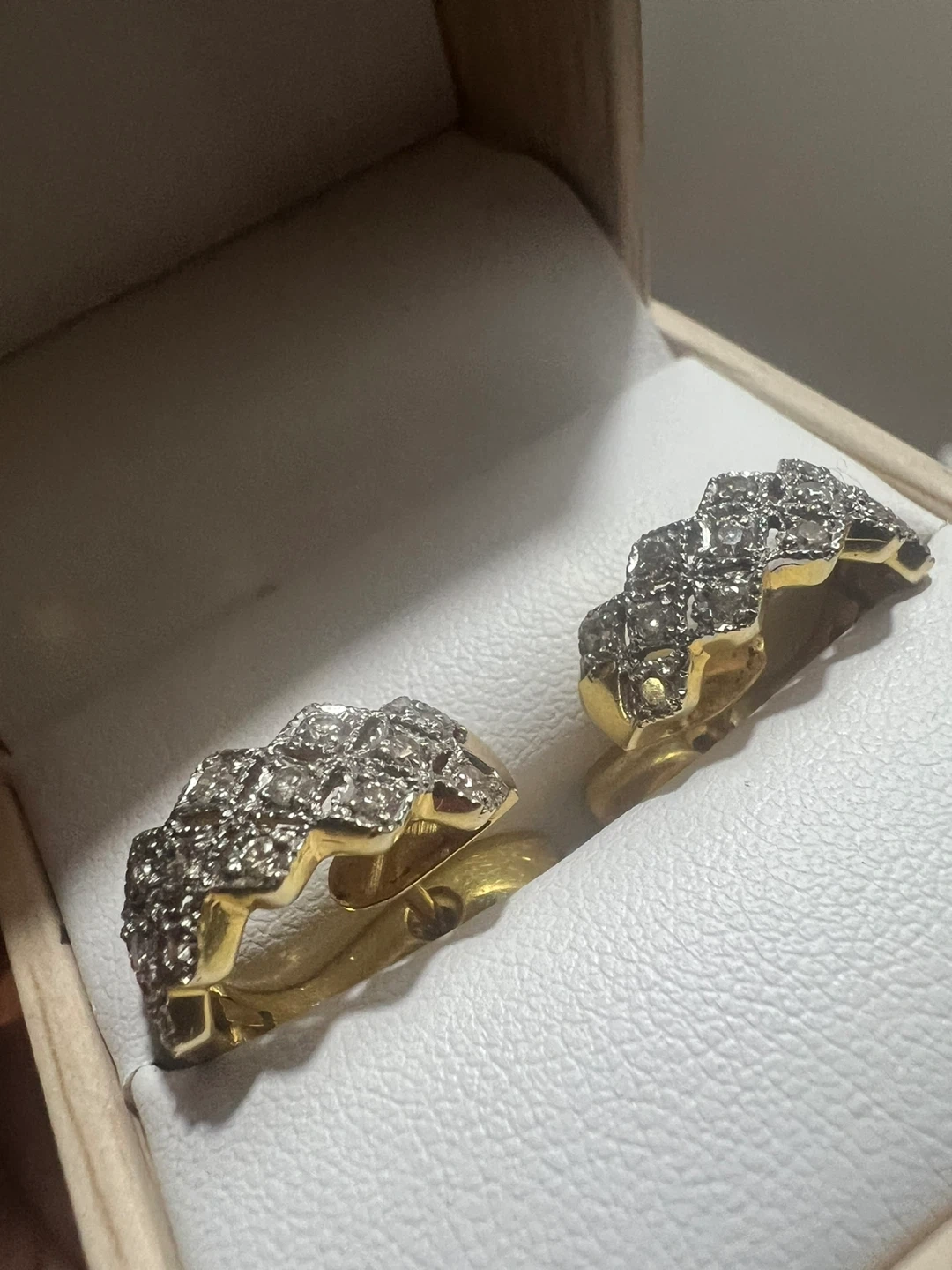 Elegant 14 k gold hoop earrings adorned with sparkling diamonds. These earrings add a touch of class to any outfit. They're perfect for a night out or a special occasion!