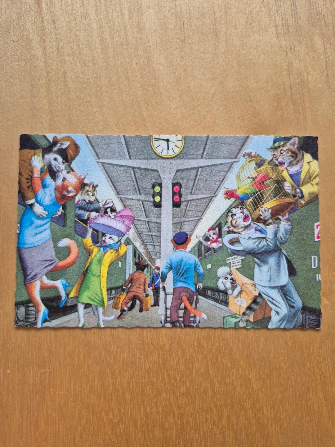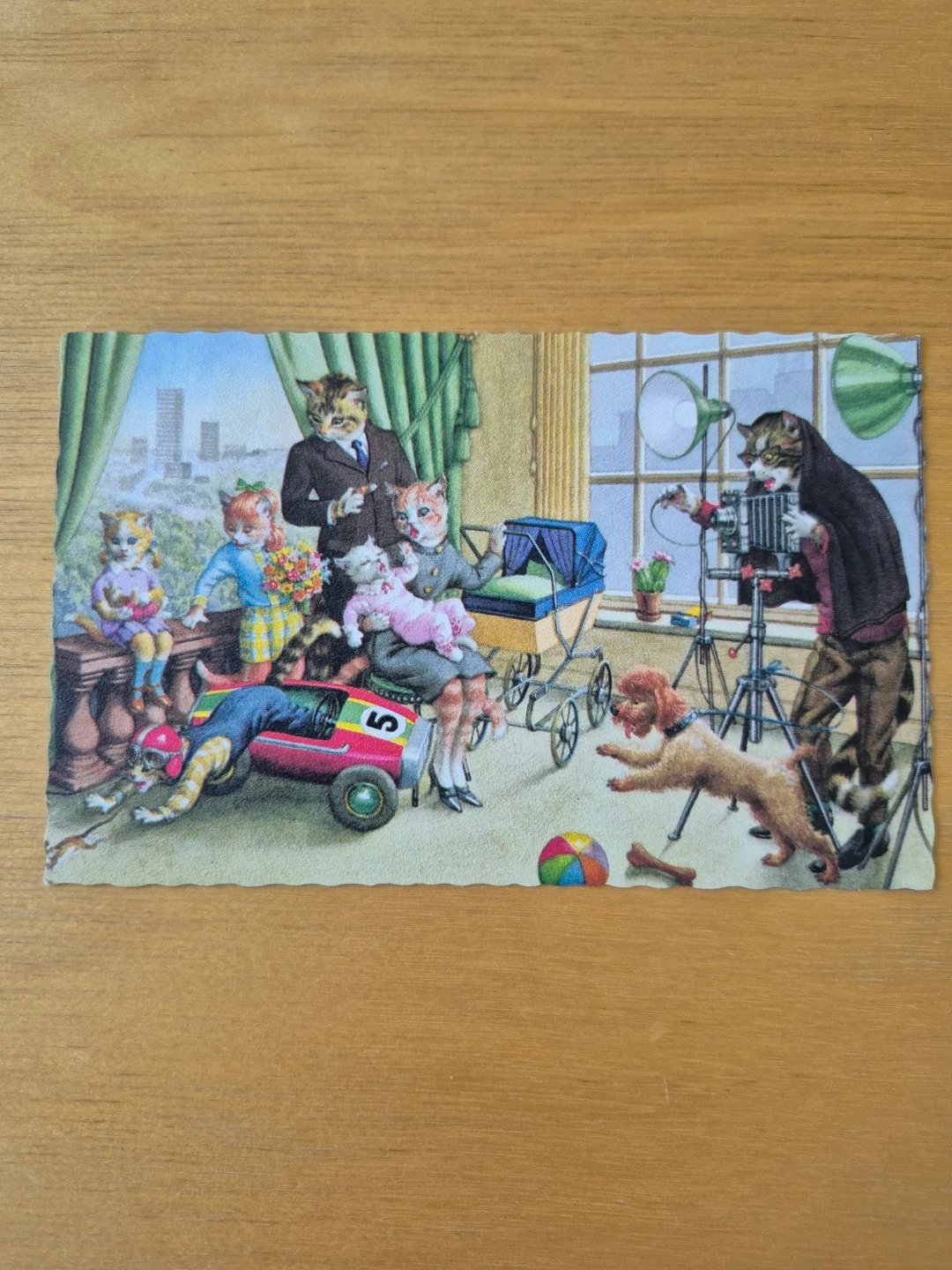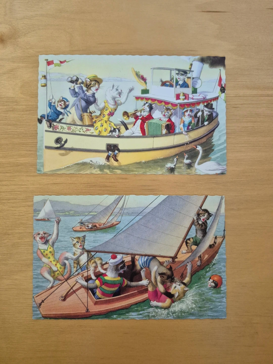 9 different designs available. These whimsical cards feature cats all dressed up in period costumes, riotously pursuing leisure activities. Full of complex detail, many have a sense of impending disaster, a simple event unravelling into a cascade of errors.