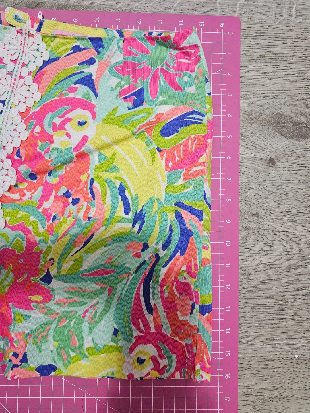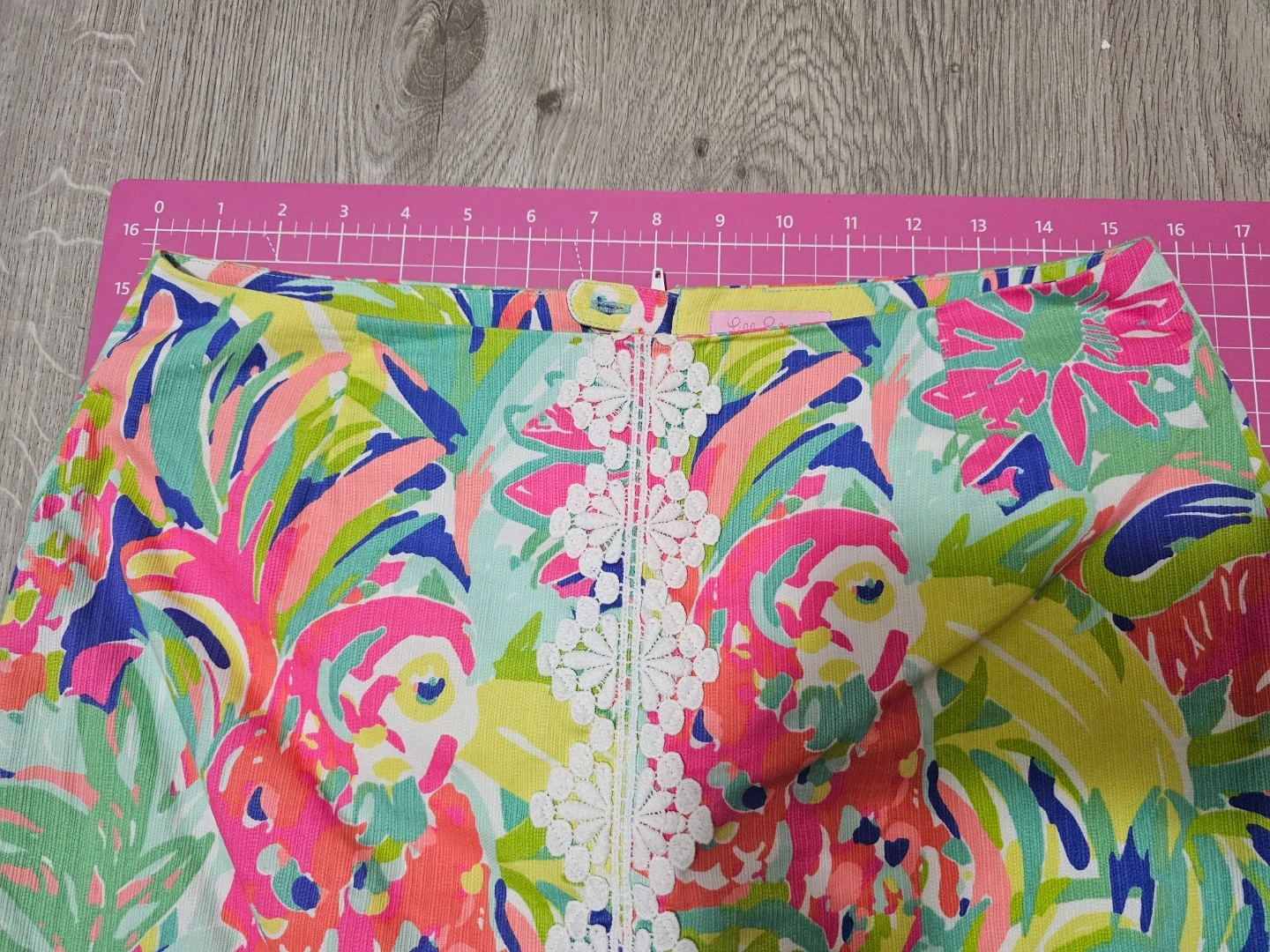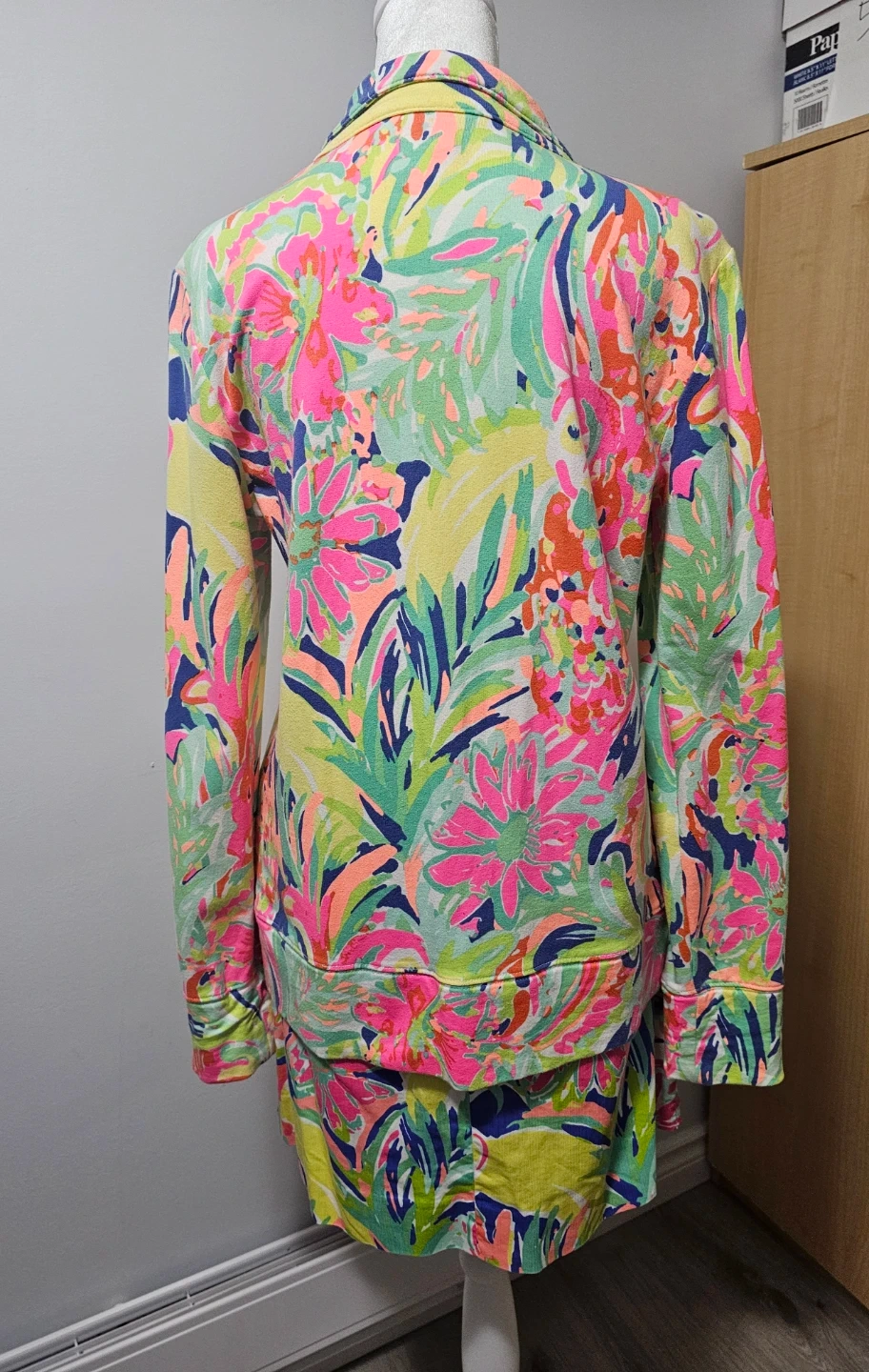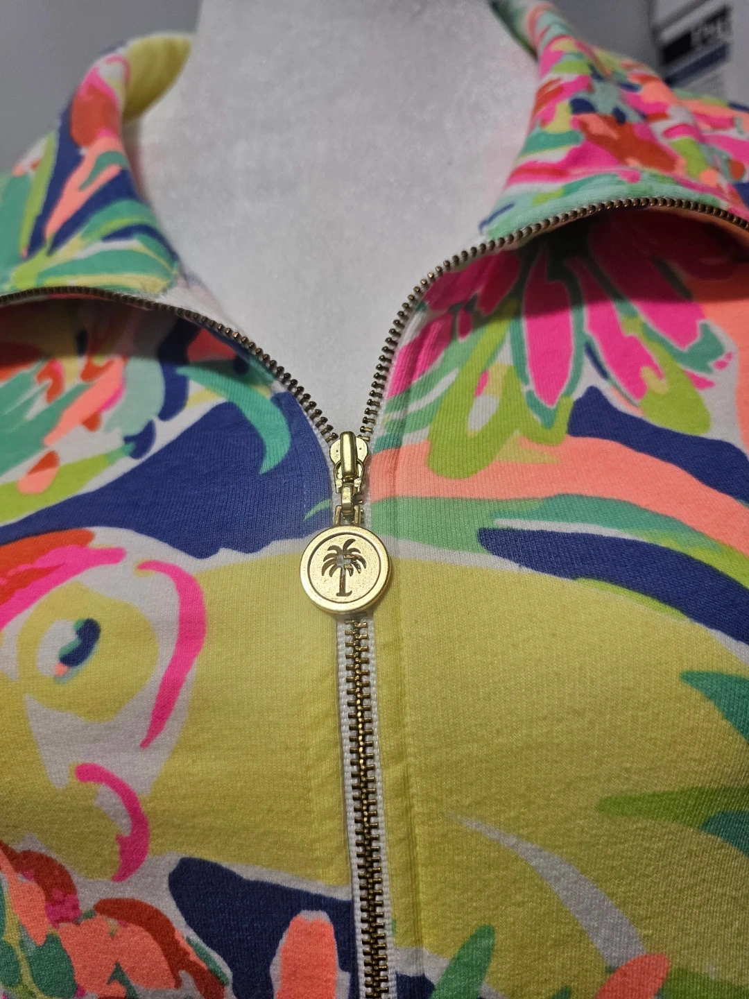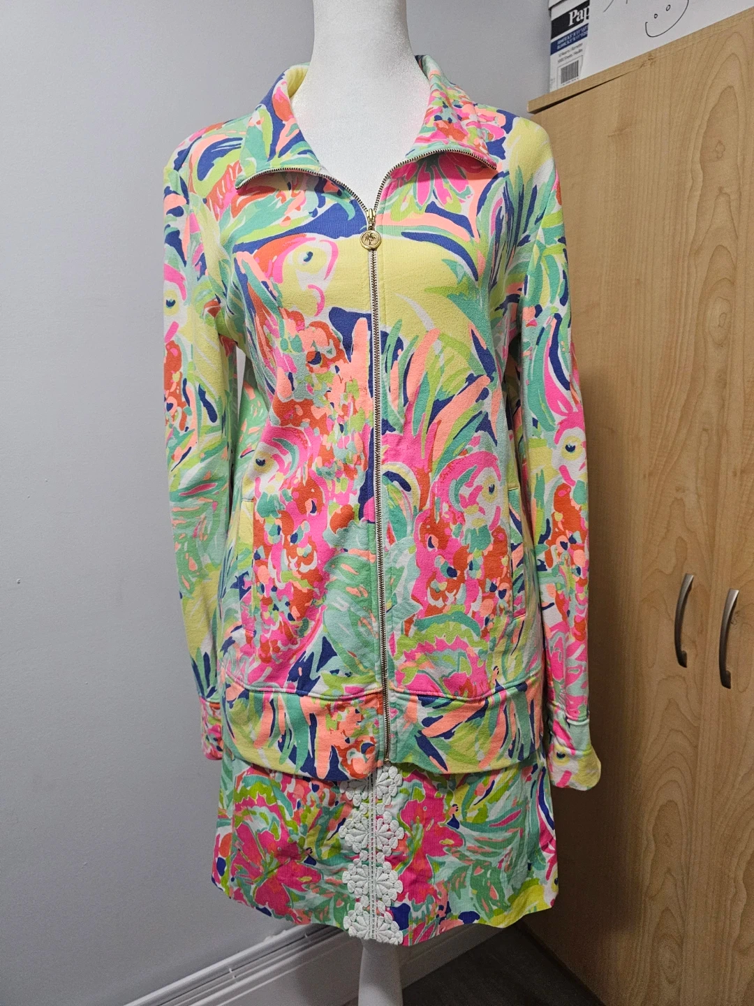 This Lilly Pulitzer set features a colourful tropical print. The zip-up sweatshirt has a collar and a gold zipper pull. The matching skirt has a white lace trim detail. Great for a casual, vibrant look!