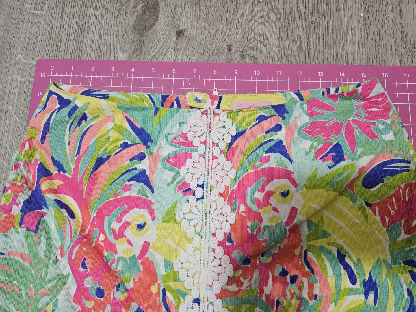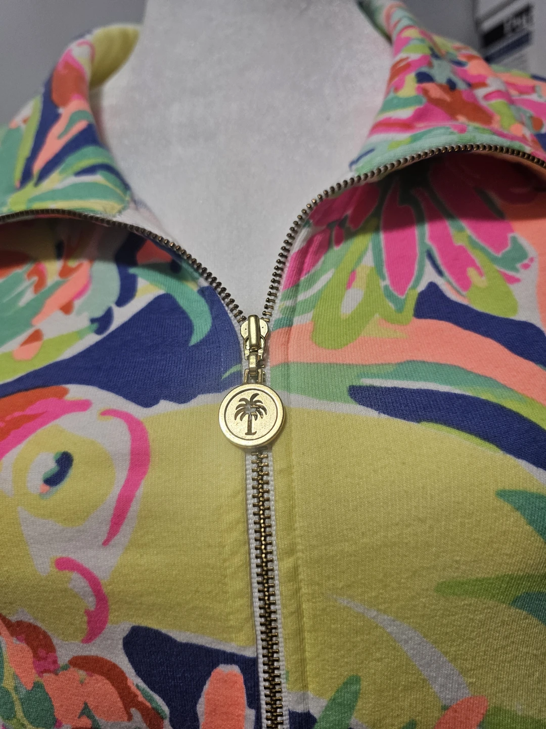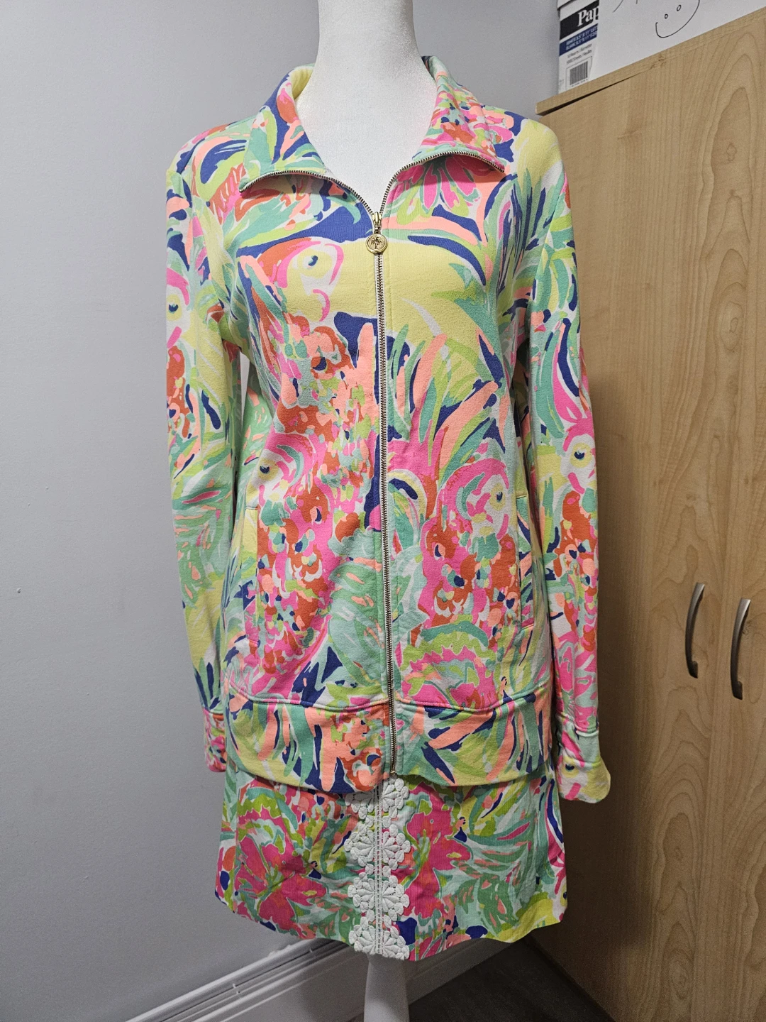 This Lilly Pulitzer set features a colourful tropical print. The zip-up sweatshirt has a collar and a gold zipper pull. The matching skirt has a white lace trim detail. Great for a casual, vibrant look!