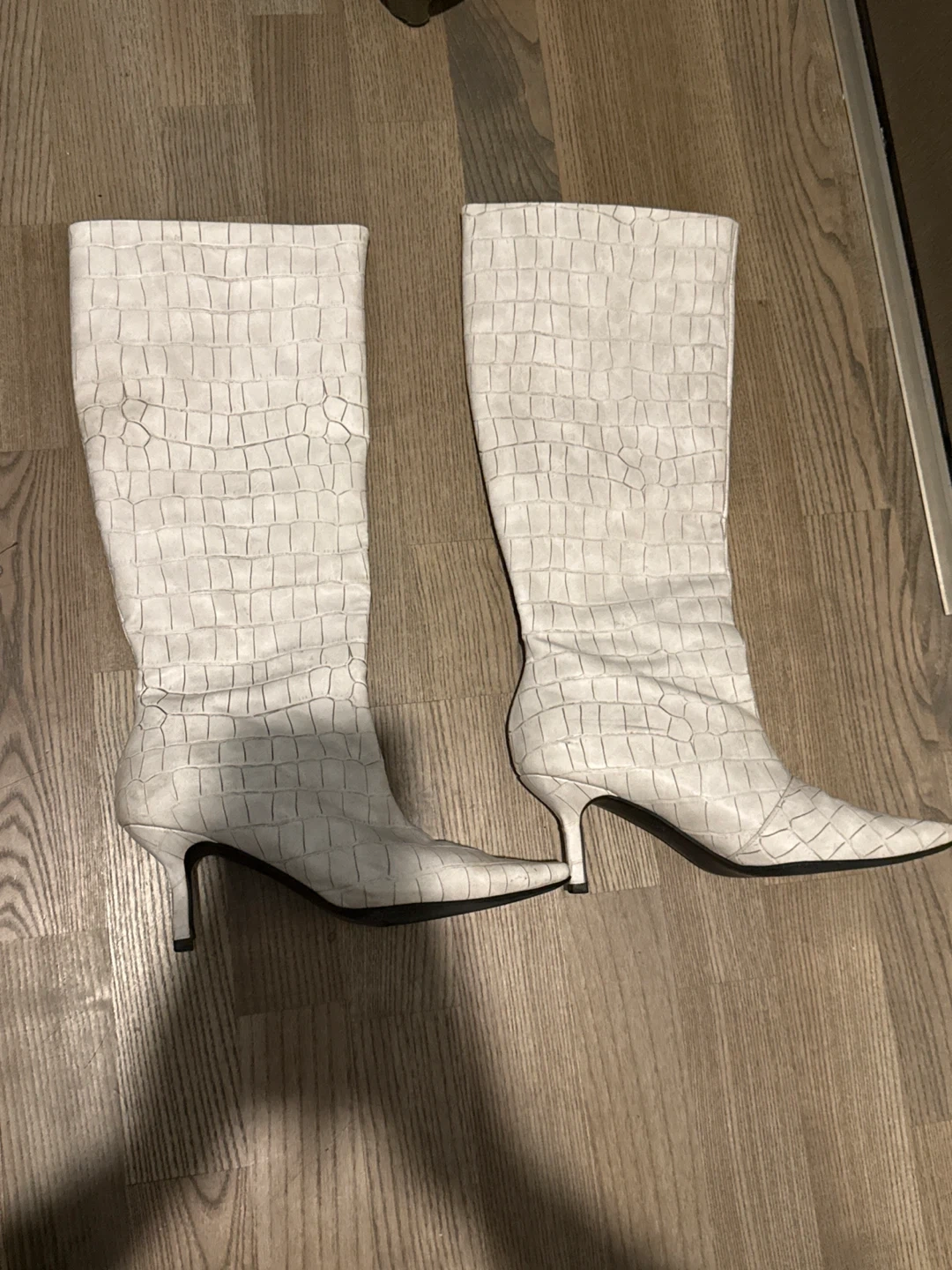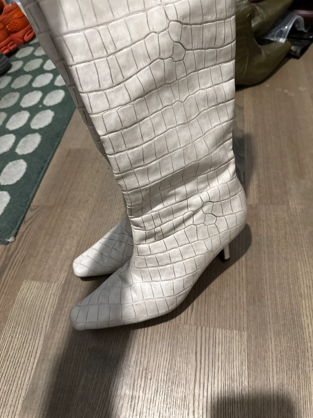 White knee-high boots with a faux crocodile texture and a pointed toe. Features a kitten heel and a pull-on style. These boots would add a stylish touch to any outfit.