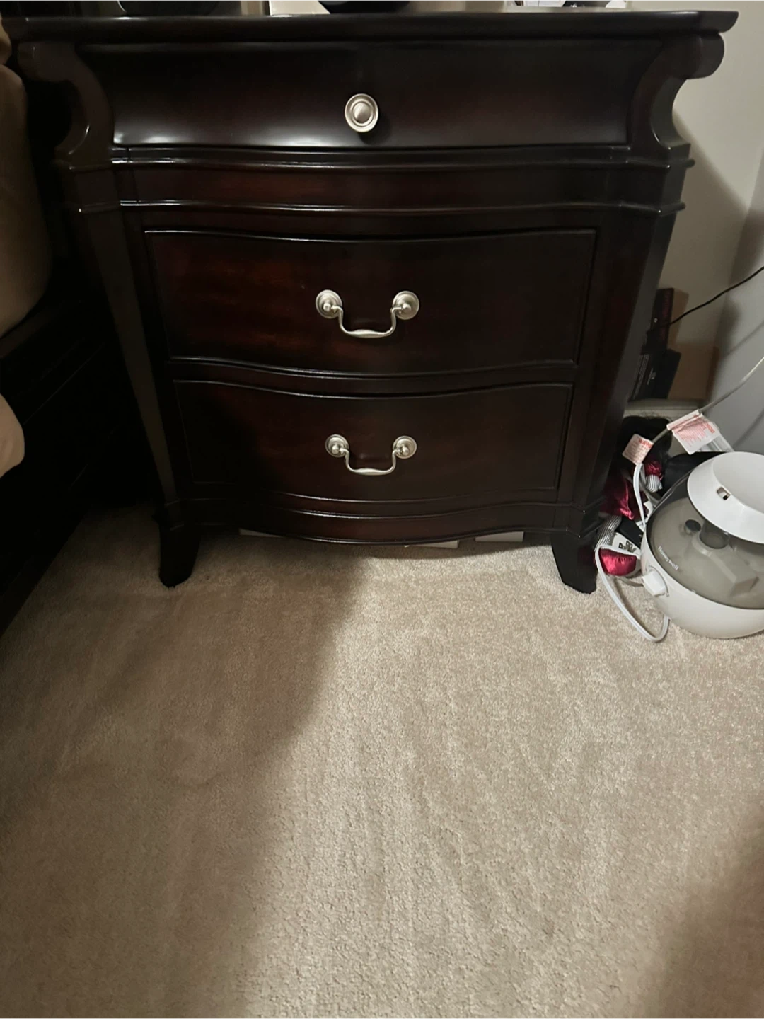 This is a dark brown wooden dresser with metal handles. It has five drawers and a curved front design. Ample storage space for clothing and linens. Two side tables in a long dresser with six drawers and small drawers on the top.