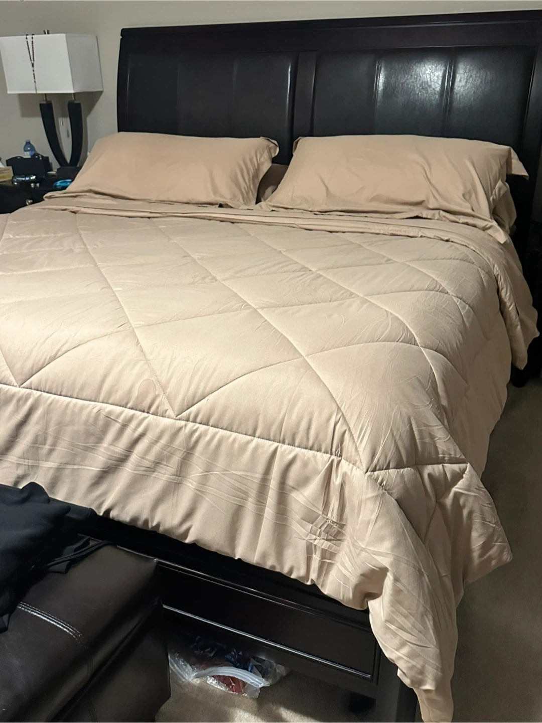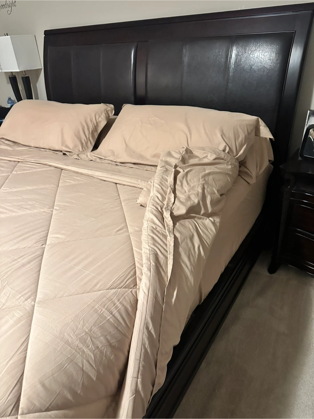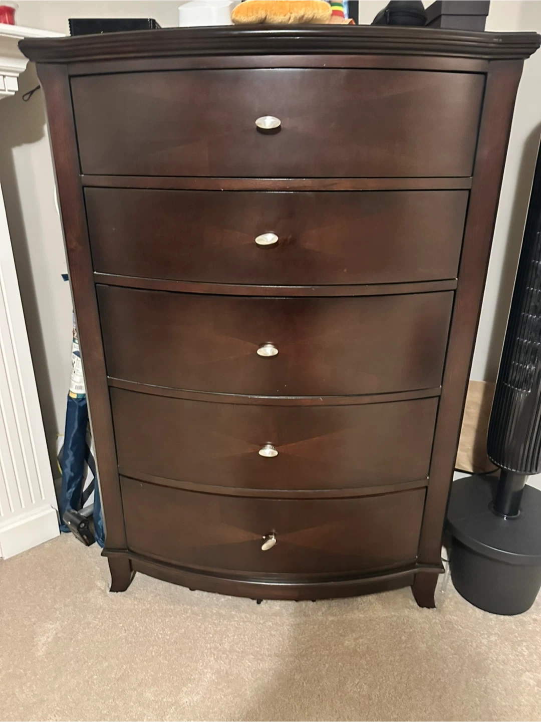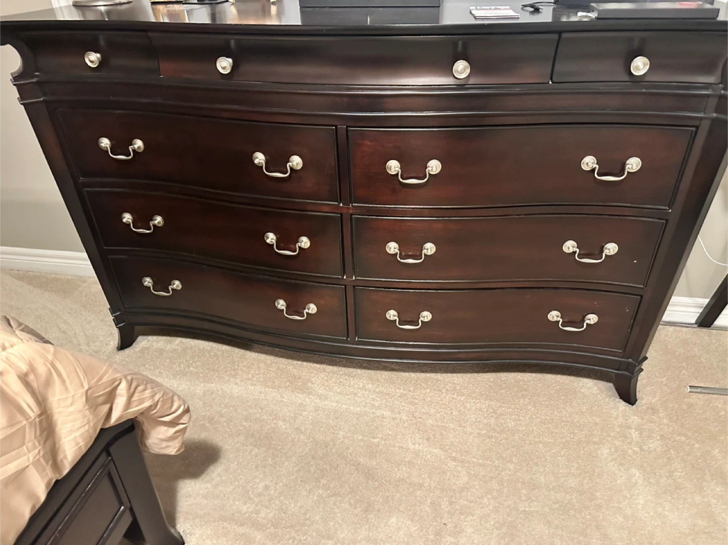 This is a dark brown wooden dresser with metal handles. It has five drawers and a curved front design. Ample storage space for clothing and linens. Two side tables in a long dresser with six drawers and small drawers on the top.