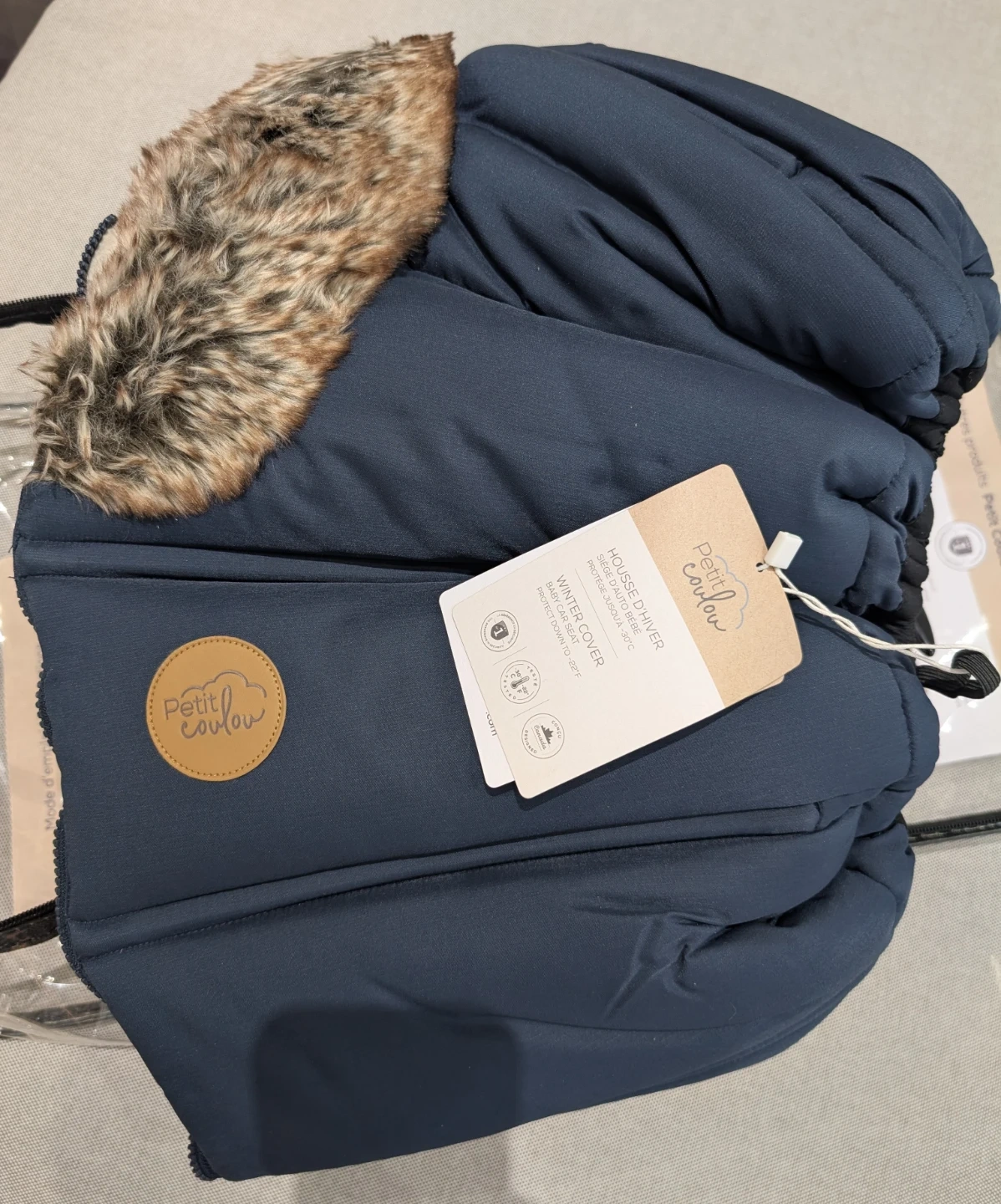 This Petit Coulou winter cover is designed for baby car seats. It's made with top-quality vegan fur and offers protection from -20°C to -30°C. It's also water-repellent and breathable. Keep your little one warm and comfy during colder months!