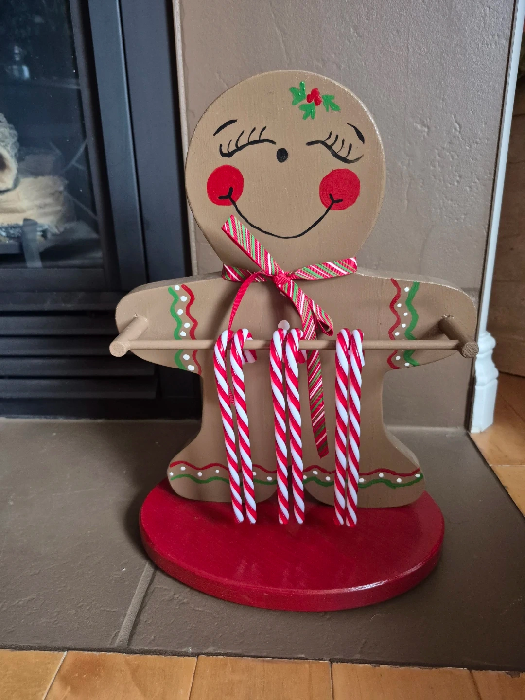 This wooden gingerbread man is a festive candycane holder. It's a charming decoration for any home, adding a cheerful touch to your Christmas display. The red base provides stability.