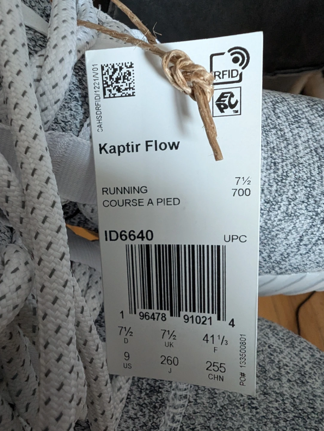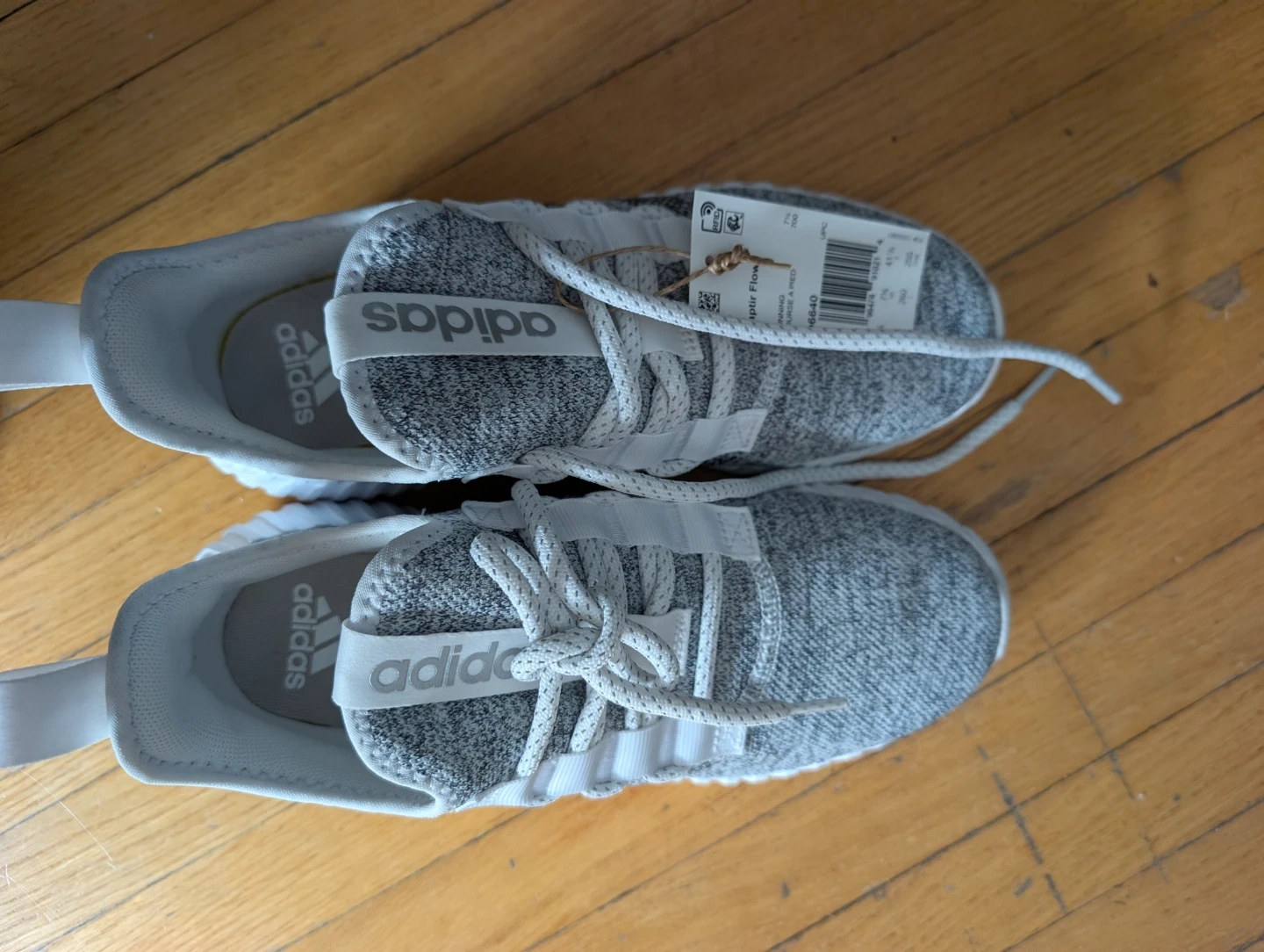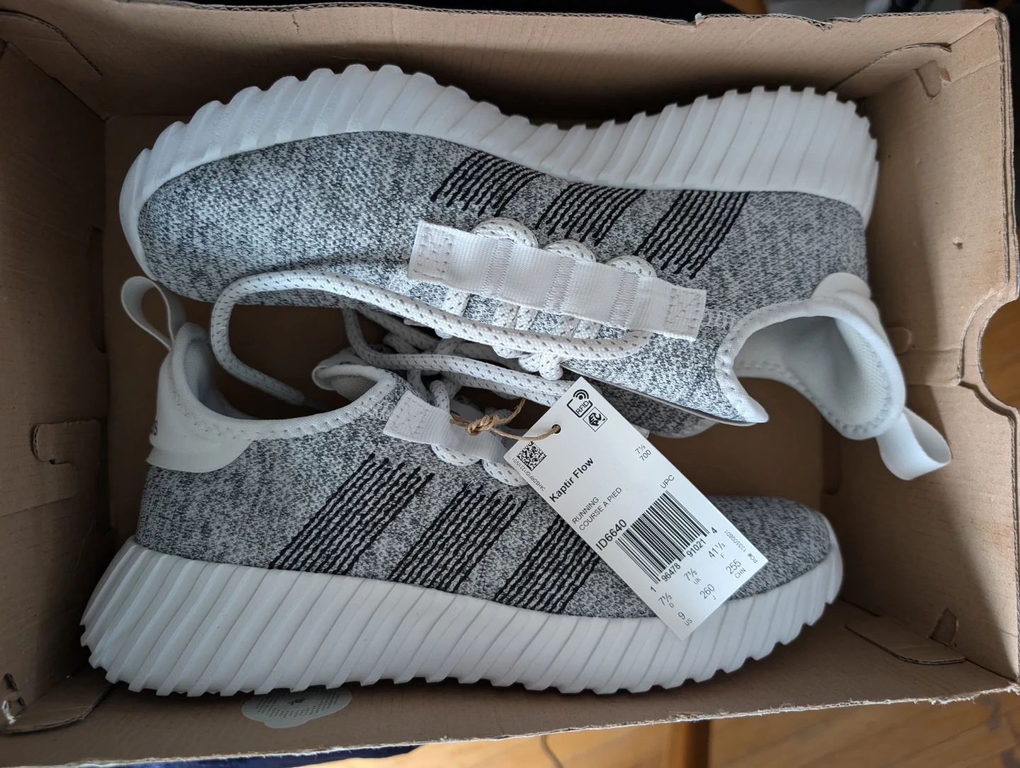 These are Adidas Kaptir Flow running shoes in a speckled grey with white accents. They're designed for running and come with their original box. Available in US size 9, UK 7.5, and EU 41 1/3.