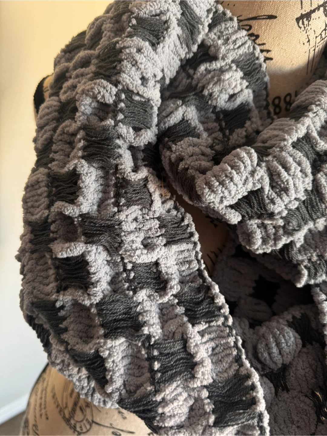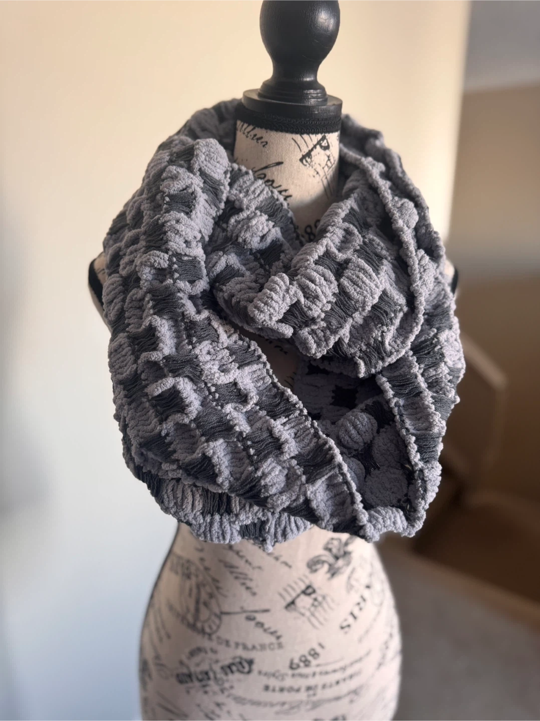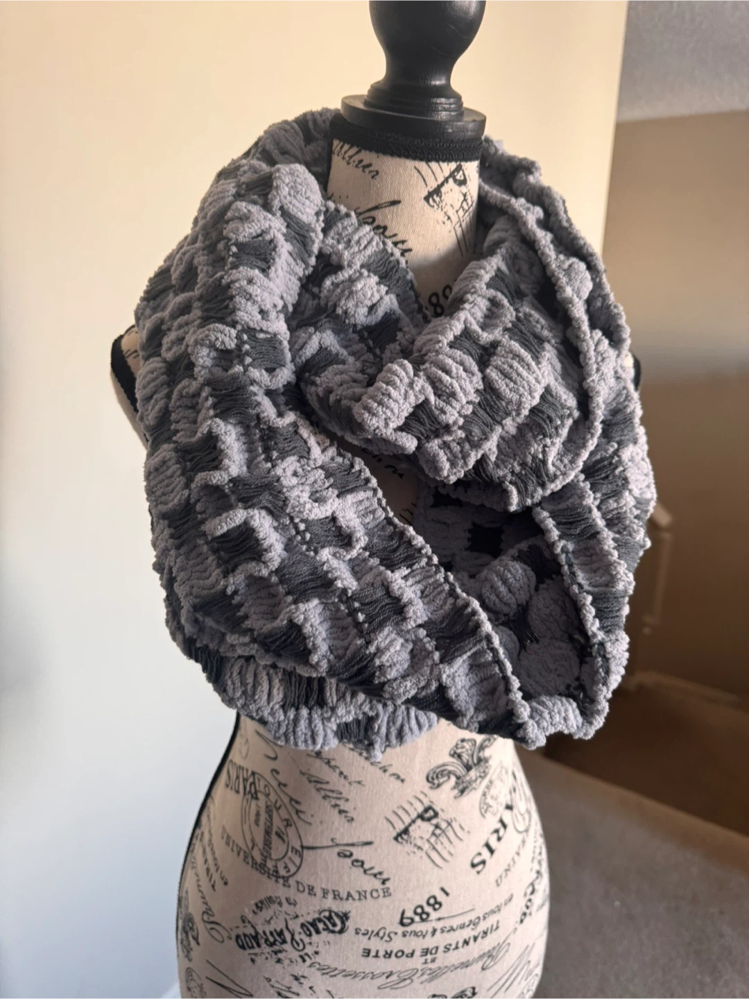 Cozy up with this stylish grey and black infinity scarf! It has a unique textured pattern that adds a touch of flair to any outfit. Perfect for keeping warm on chilly days!