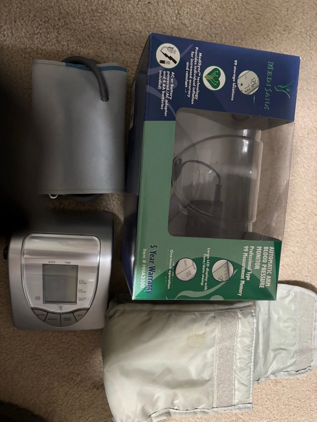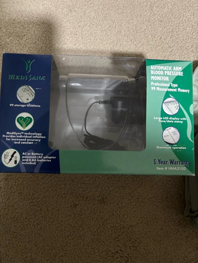 Selling a well-cared-for MediSana Automatic Arm Blood Pressure Monitor, Professional Type. It accurately measures blood pressure with MediSync technology and stores up to 99 measurements. Key features include a large LCD display with time/date, one-touch operation, and AC or battery power (AC adapter and 4 AA batteries included). Similar monitors typically sell for $30-$60. Priced fairly for its condition and features. If the ad is up, it's available.