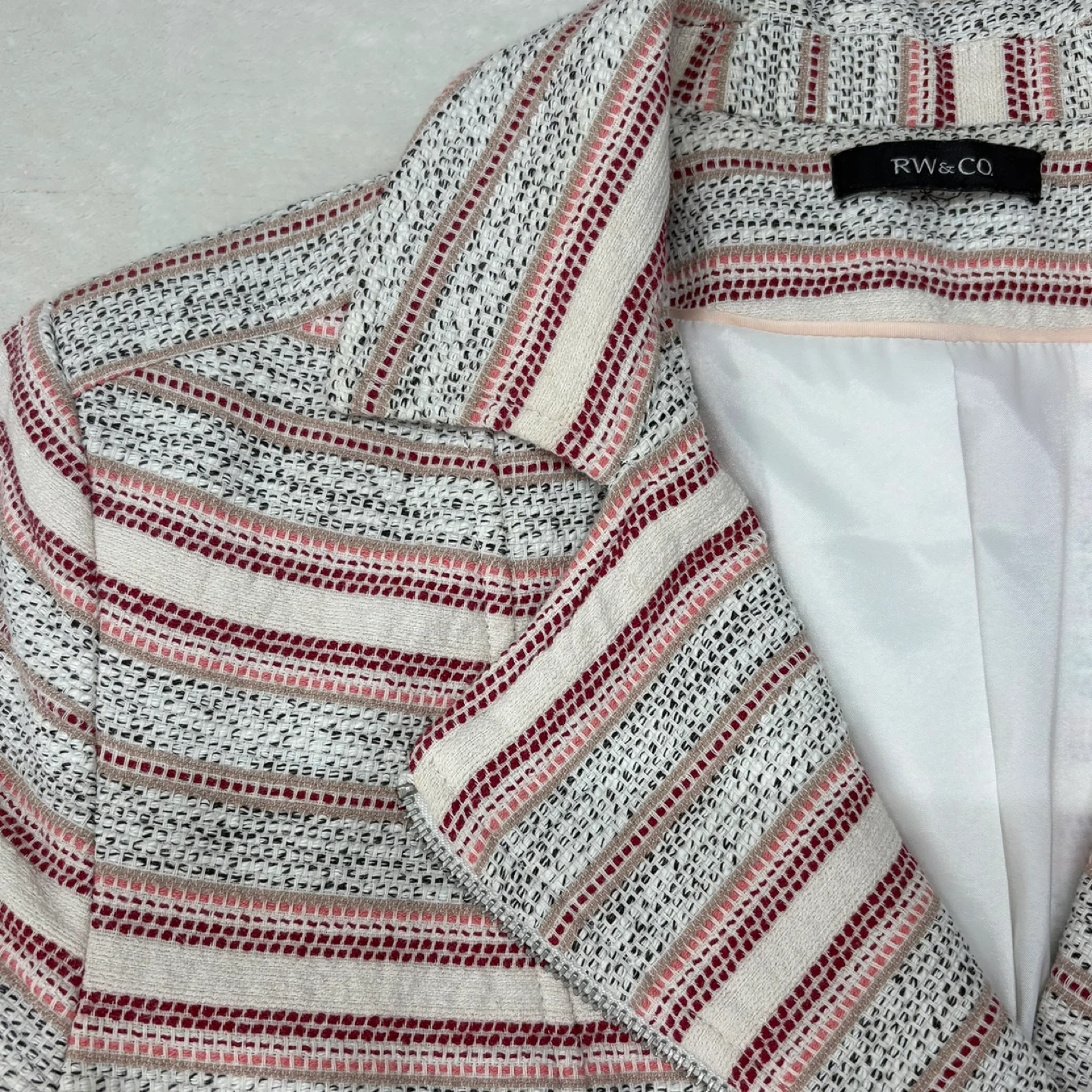 Bring a unique flair to your professional wardrobe with this RW&CO textured jacket. Featuring a white base with red and coral stripes and black flecks, this piece stands out with its modern off-centered zipper closure. The moto-inspired silhouette combined with the soft textured knit fabric creates a look that is both structured and comfortable. It features front zippered pockets and clean lines, perfect for layering over a simple top.