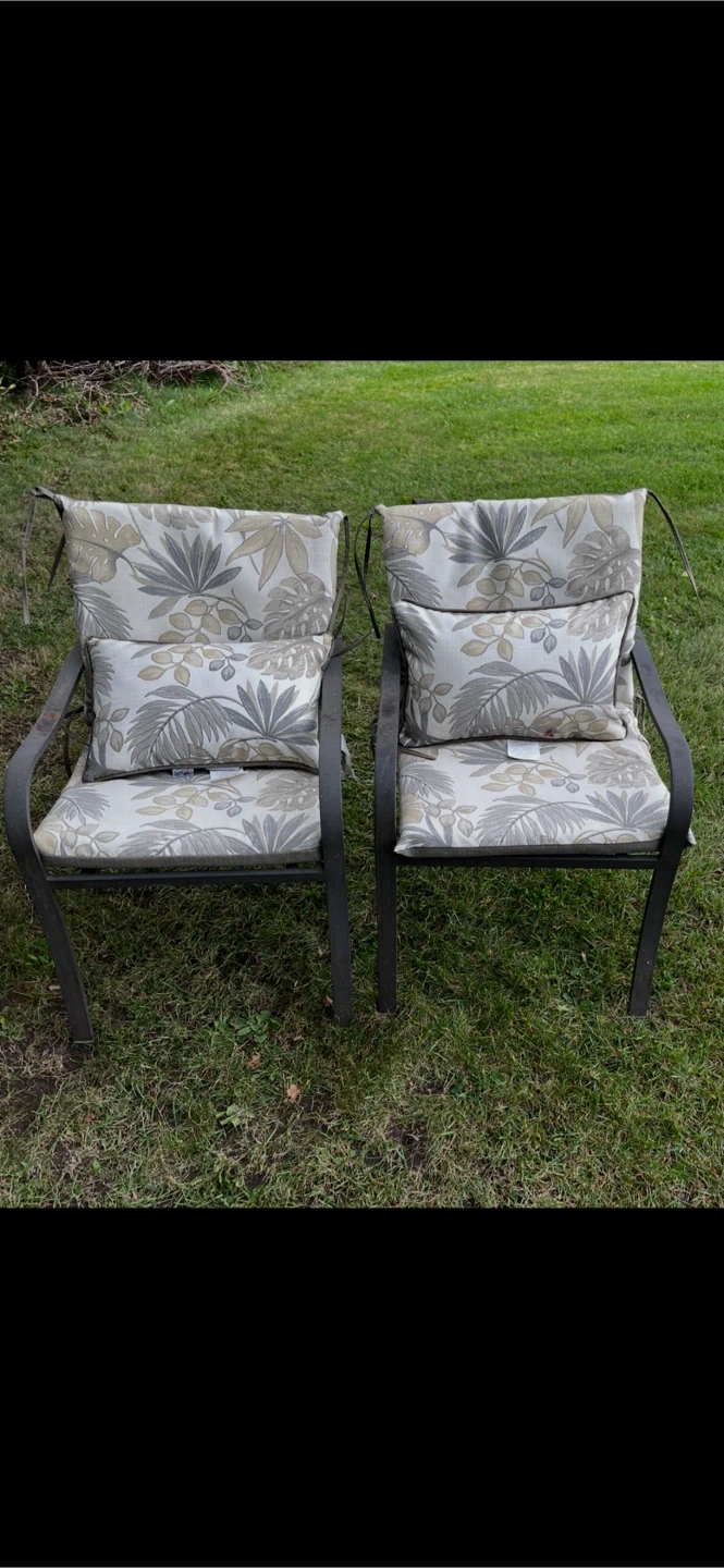 Two outdoor chairs with a tropical leaf pattern on the cushions. They have dark metal frames and come with seat and back cushions, plus a lumbar pillow. Perfect for relaxing on your patio!