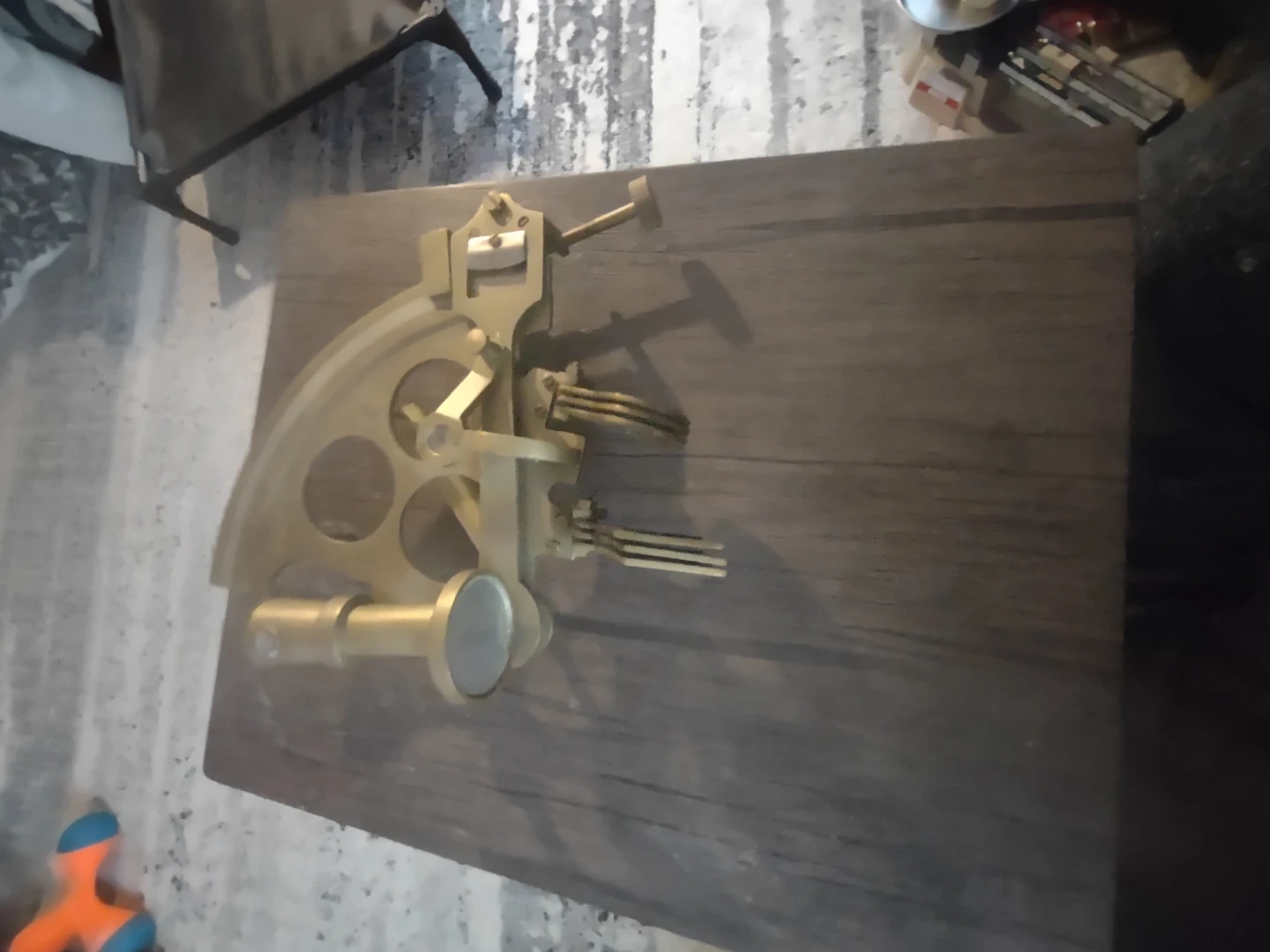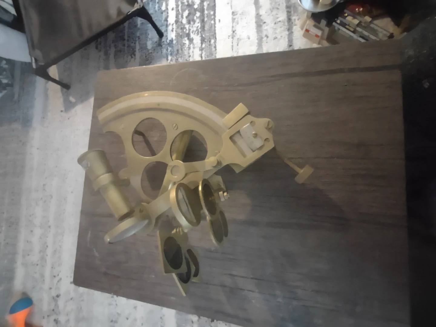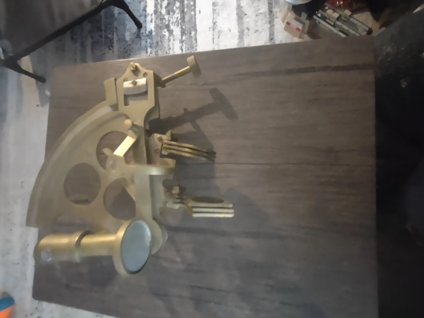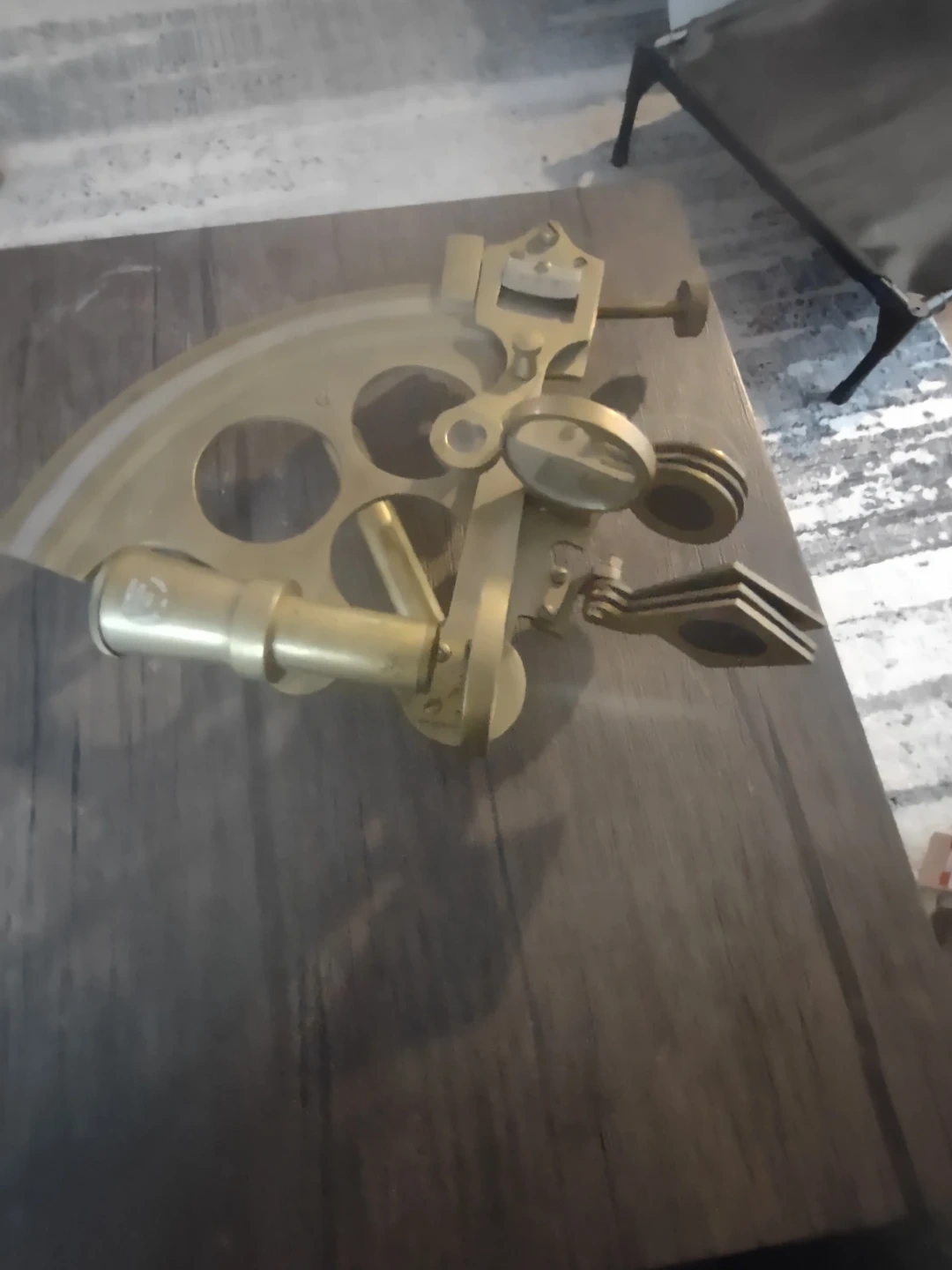 A brass sextant for nautical navigation. It's made of brass and features a scope and arc for measurements. This tool is suitable for maritime enthusiasts and collectors.
