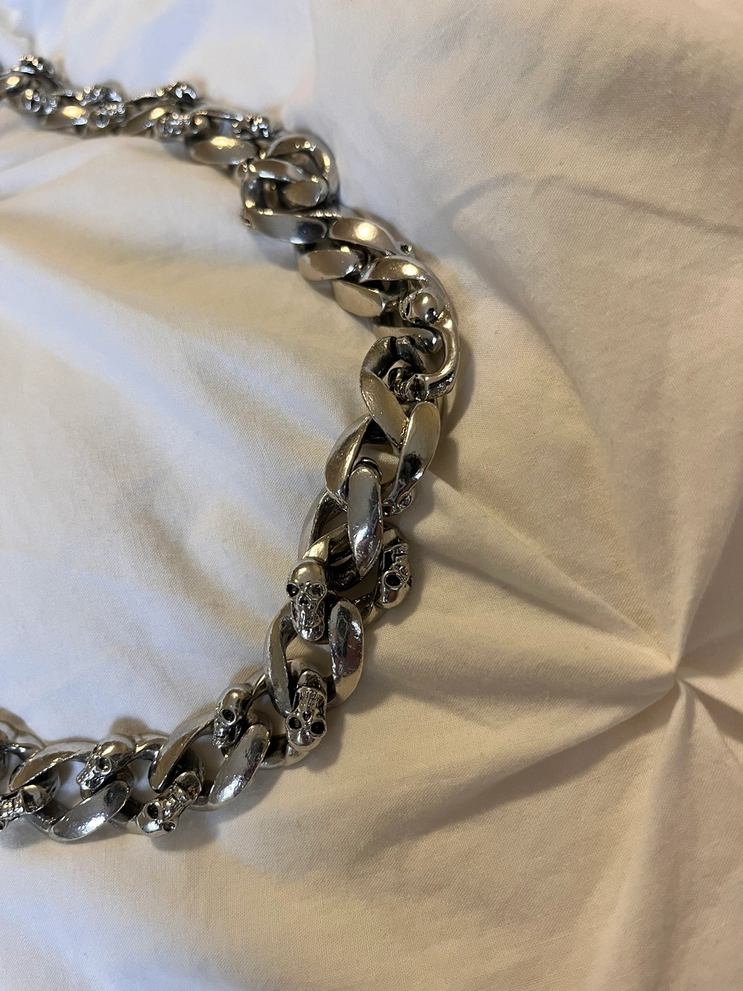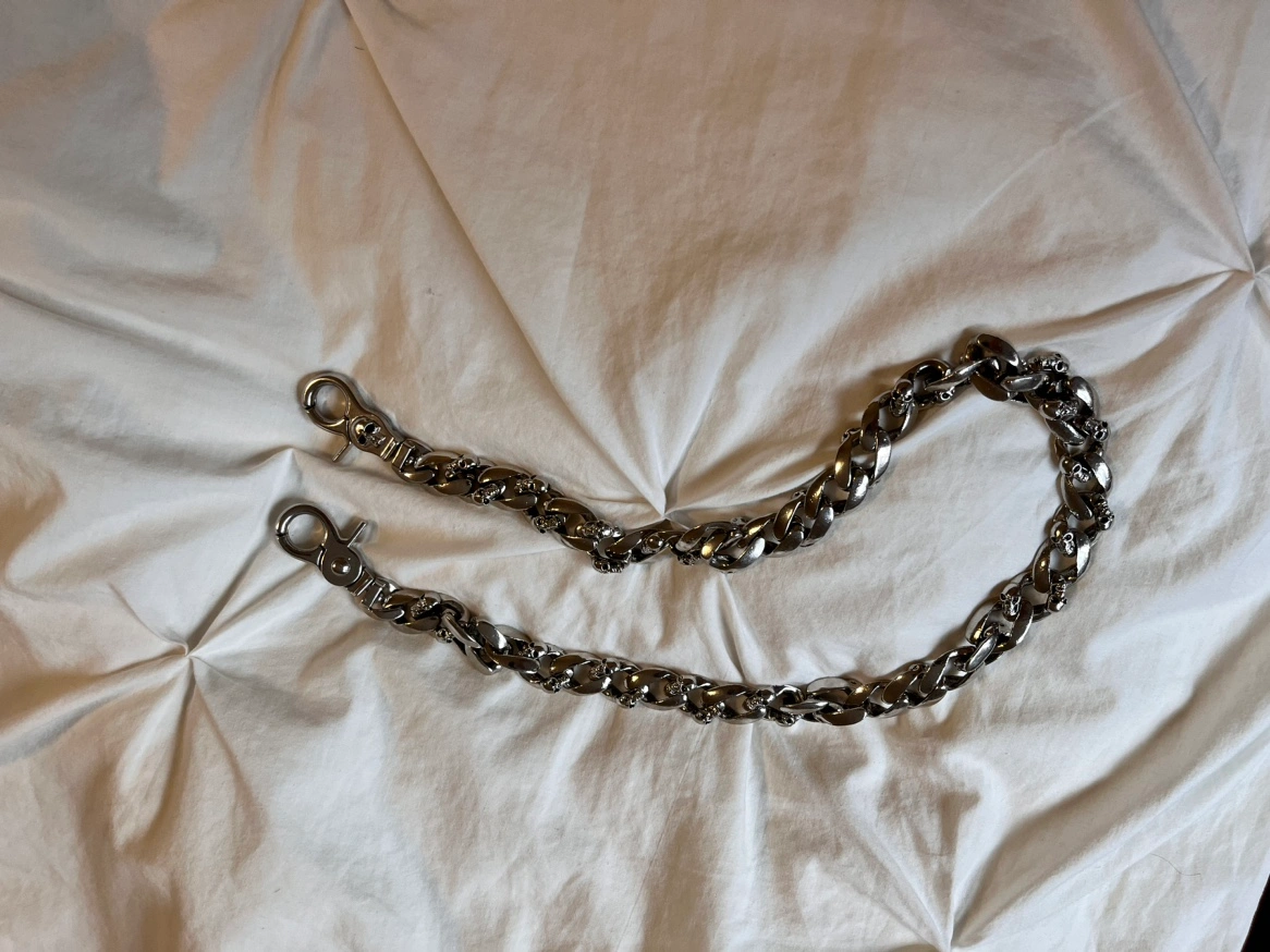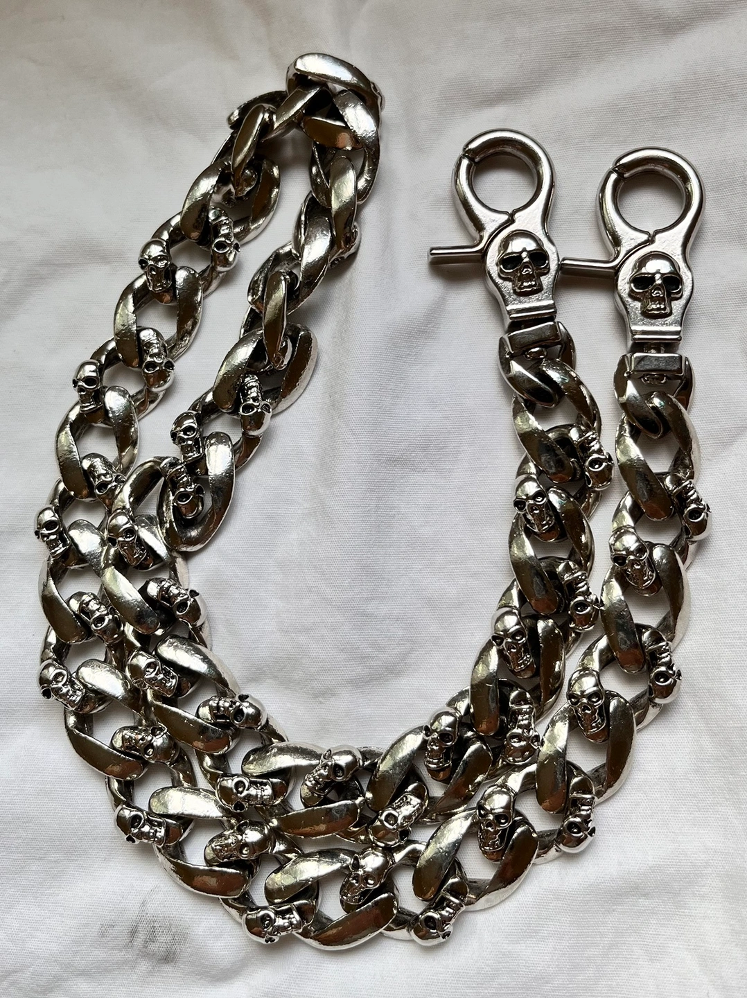 A metal chain with skull details. It is approximately 26.5 inches long. It can be worn as a belt chain or wallet chain heavy Biker. It has two clasps.