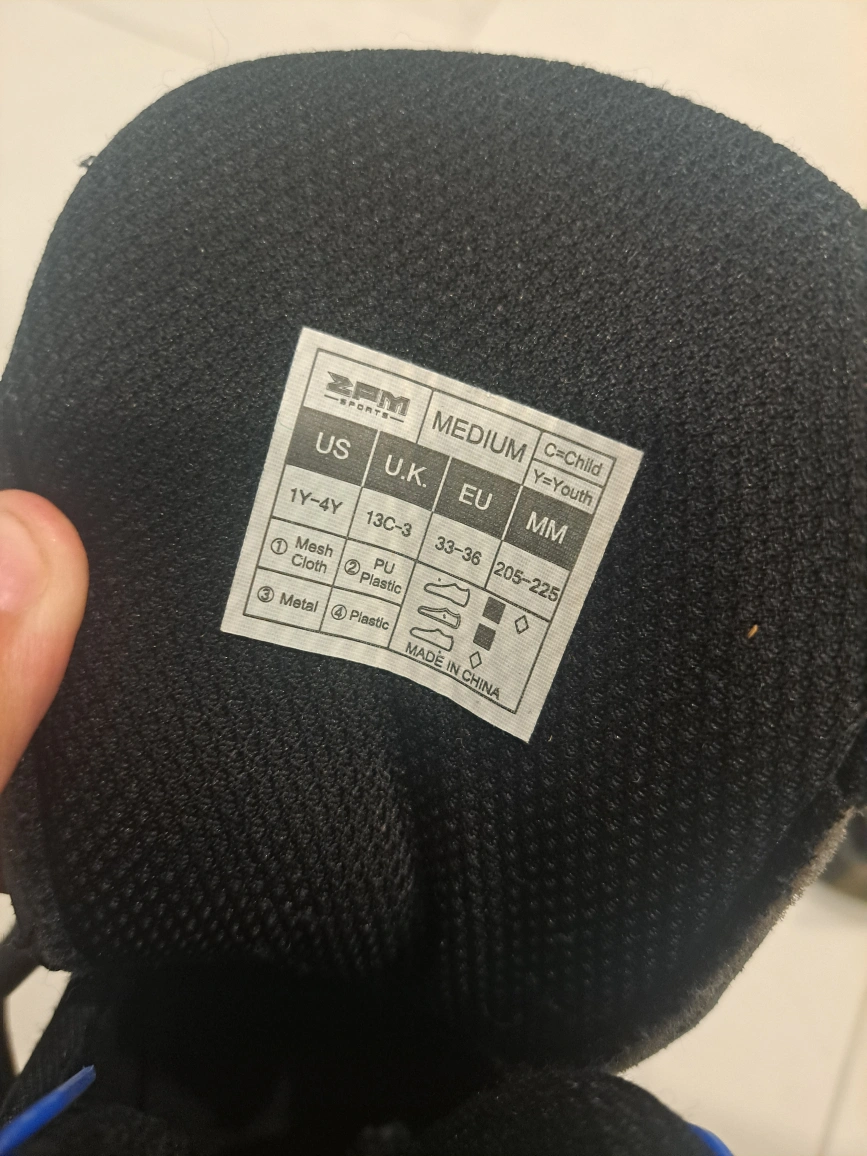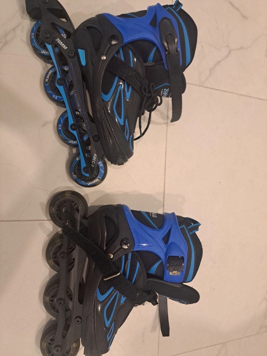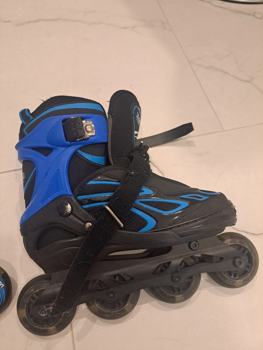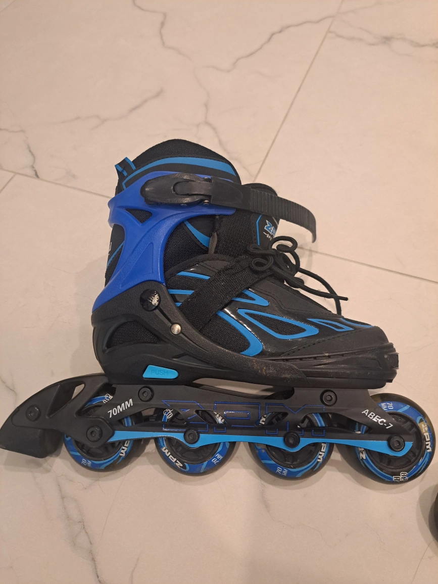 Selling a pair of ZPM Sports inline skates in youth size medium. These are US size 1Y to 4Y, EU size 33-36. They feature a black and blue design and have 70mm wheels with ABEC-7 bearings. Great for kids learning to skate!