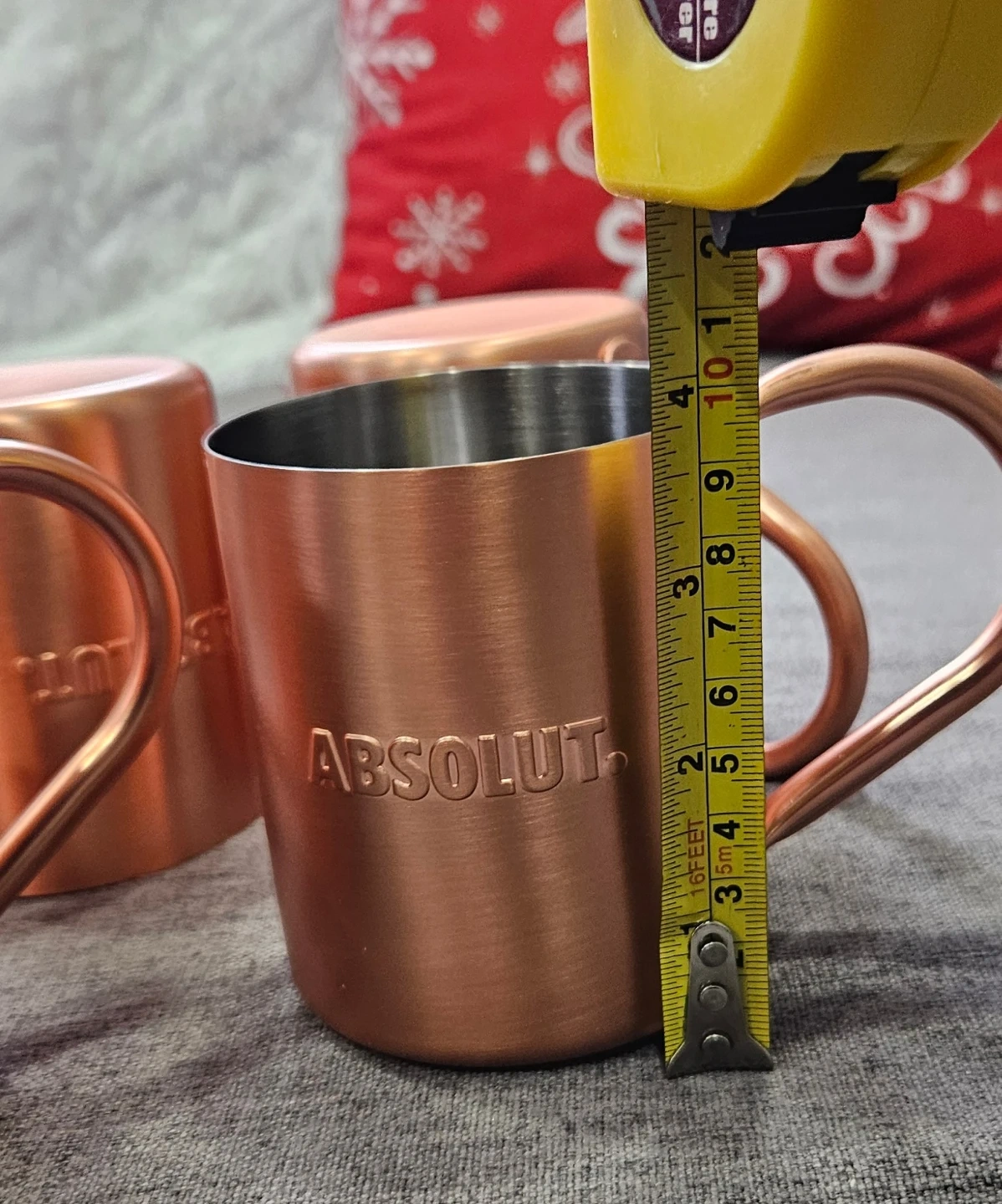 Selling a set of four copper Moscow Mule mugs from Absolut! They're in great shape and ready for your next cocktail night. Each mug has the Absolut logo embossed on the side. They stand about 4 inches tall. Perfect for enjoying a classic Moscow Mule or any other chilled beverage