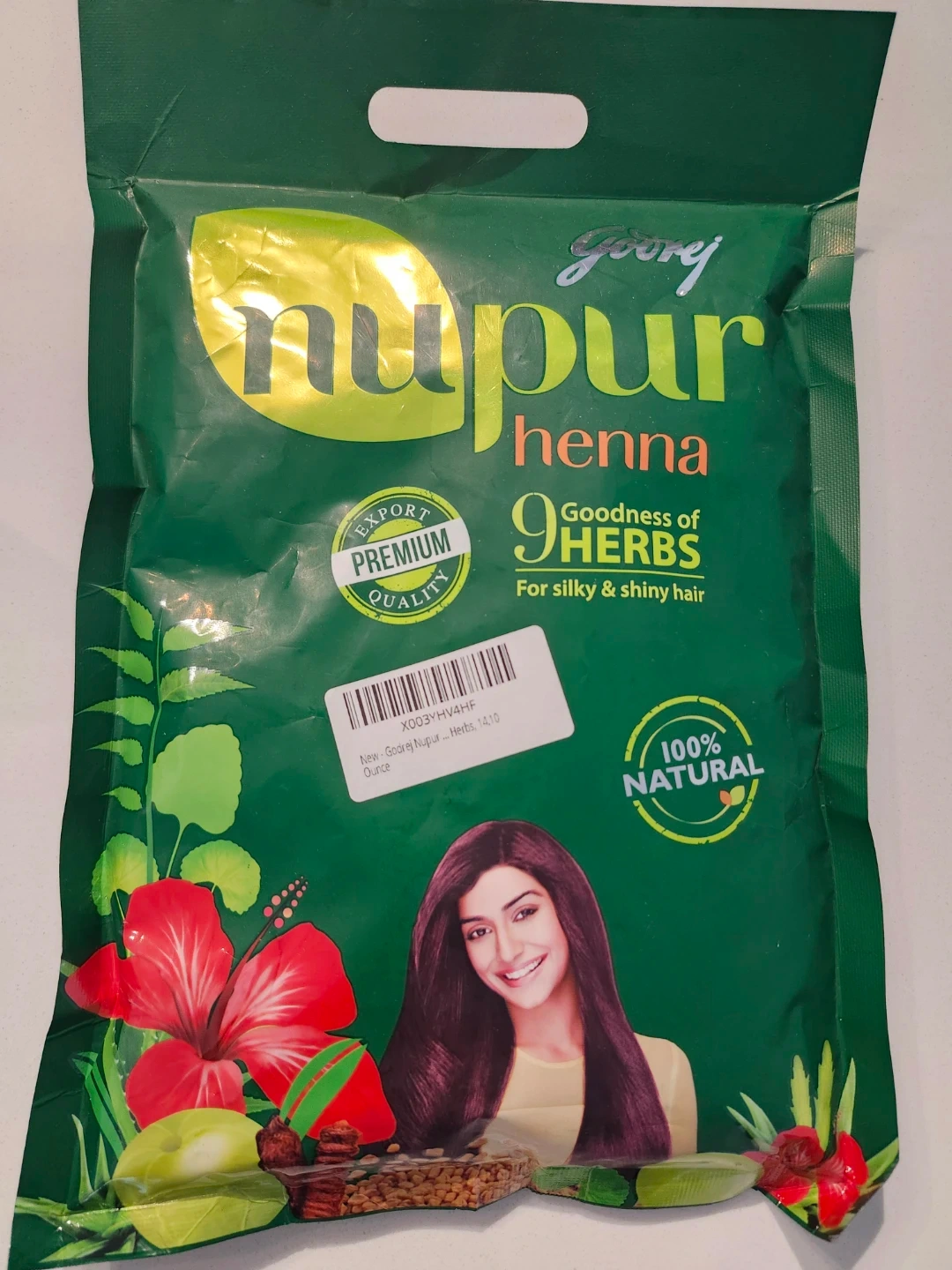 This is Godrej Nupur henna, a 100% natural product. It contains the goodness of 9 herbs for silky and shiny hair. The package is 14.10 ounces.