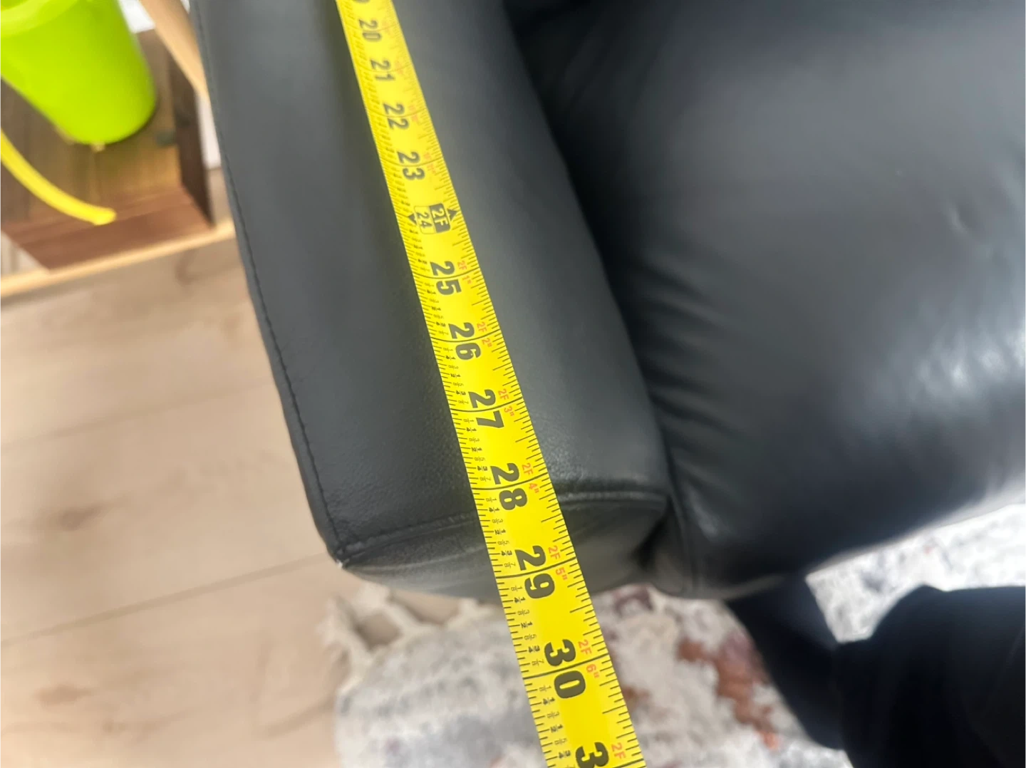 This is a black leather sofa and an armchair. The sofa measures approximately 80 inches in length. The armchair is about 35 inches wide. Both pieces are made of genuine leather.