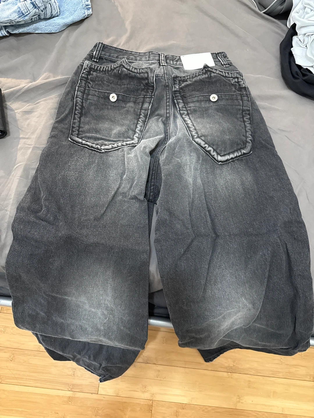 These black baggy jeans have a distressed wash and wide leg fit. They are made of denim. These jeans are great for a casual, stylish look. Made in Korea 100% from Korea