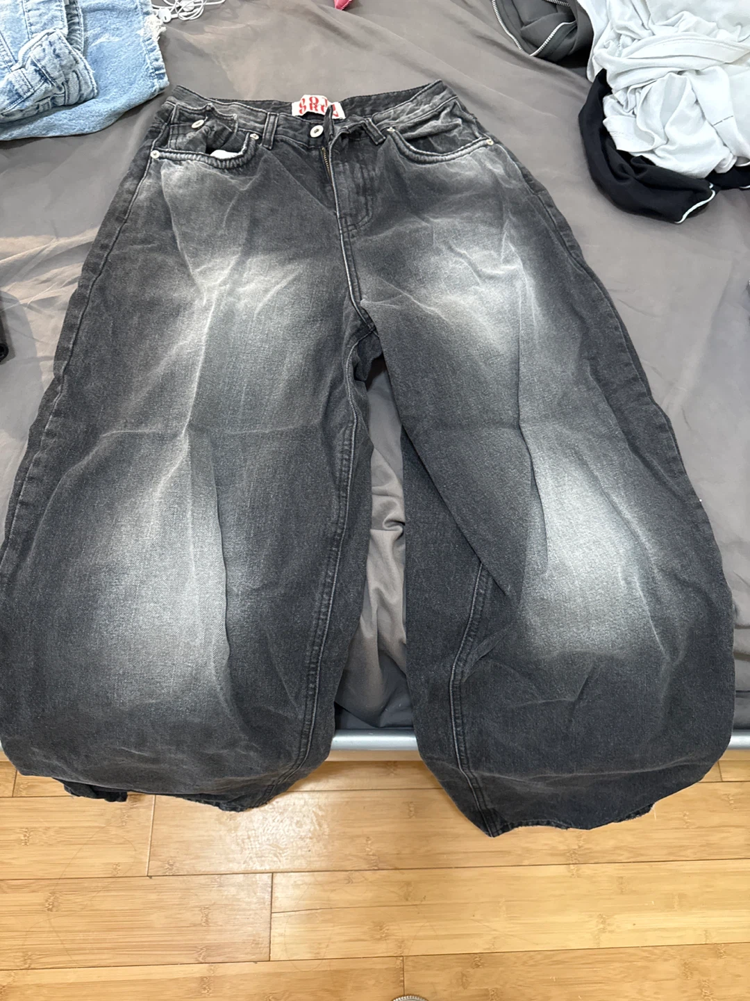 These black baggy jeans have a distressed wash and wide leg fit. They are made of denim. These jeans are great for a casual, stylish look. Made in Korea 100% from Korea