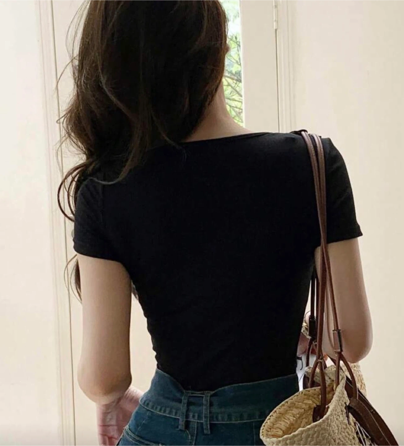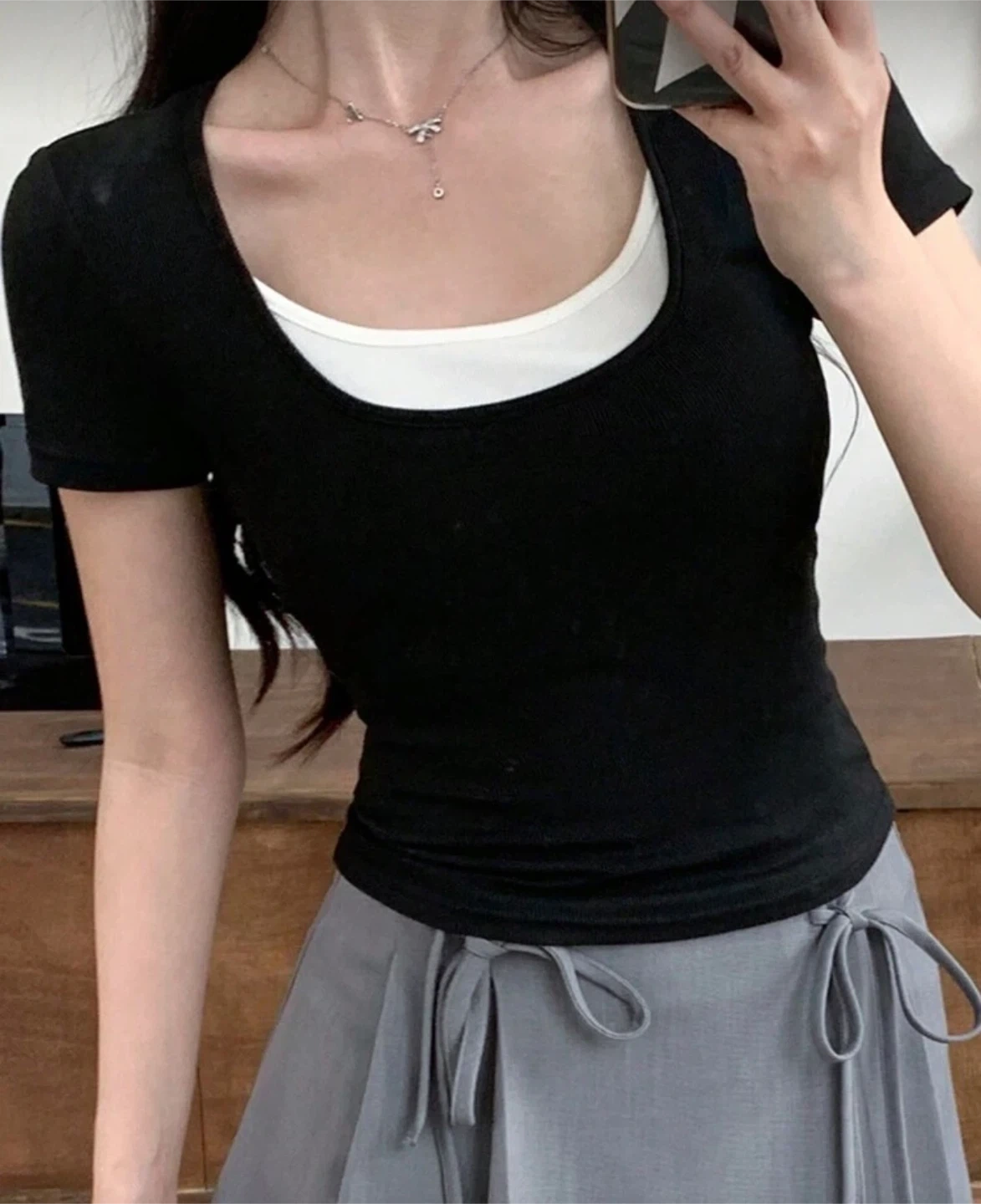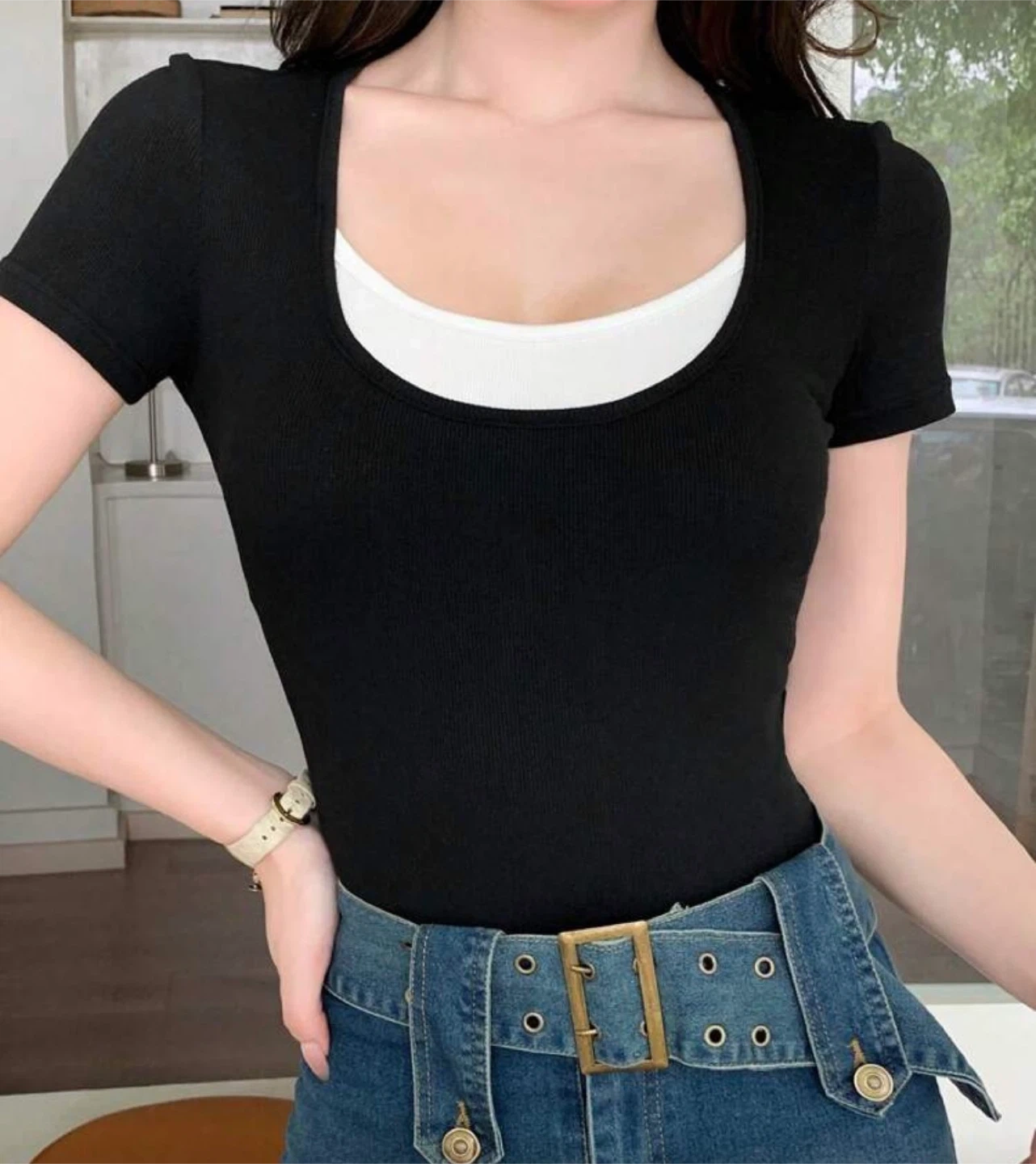 This is a women's short-sleeve black t-shirt with a ribbed texture. It features a layered look with a white underlayer. Made from a stretchy knit fabric for a comfortable fit.