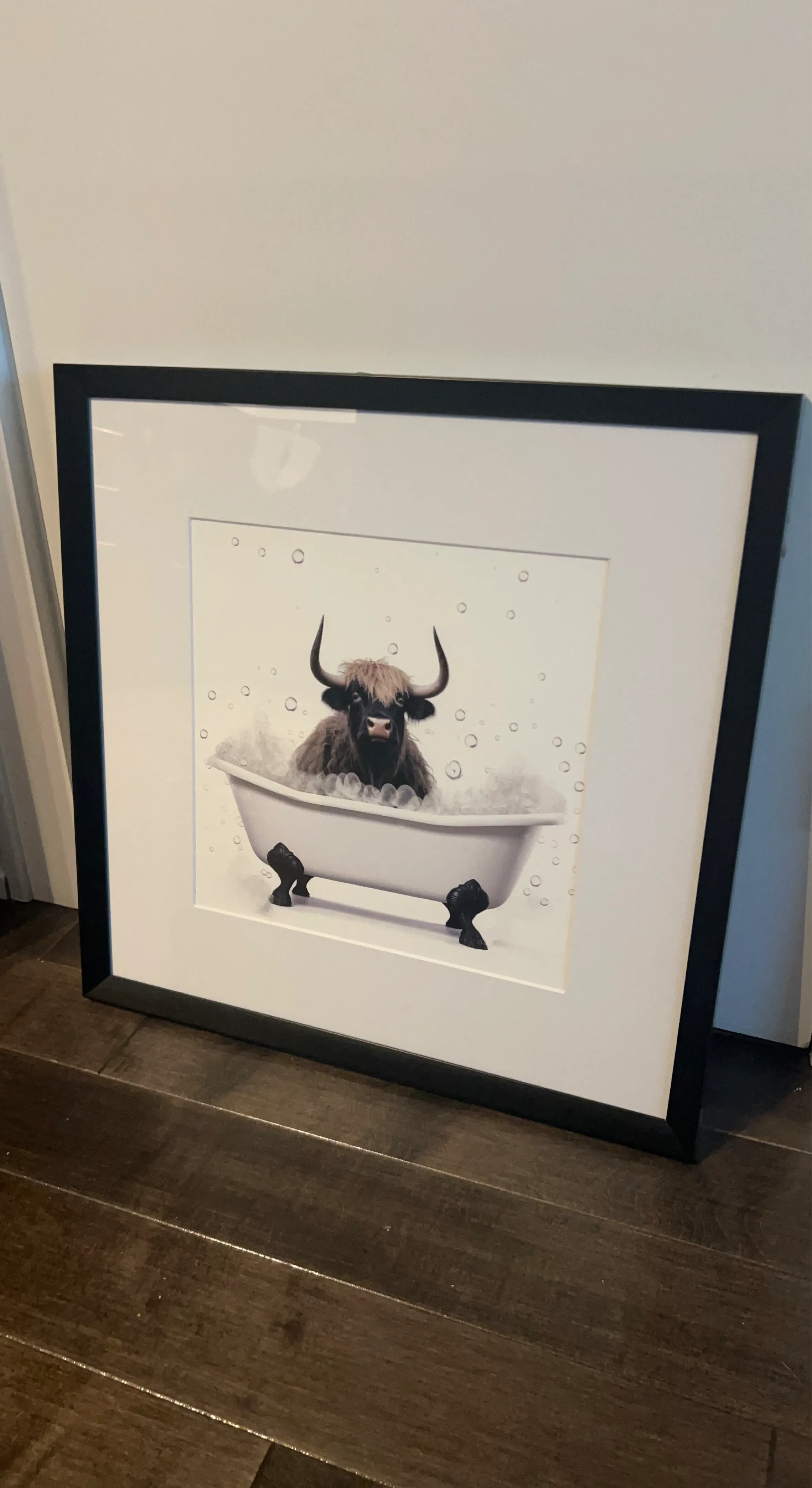 Framed art print featuring a highland cow enjoying a bubble bath. Black frame with white matting. Adds a touch of whimsical charm to any room!