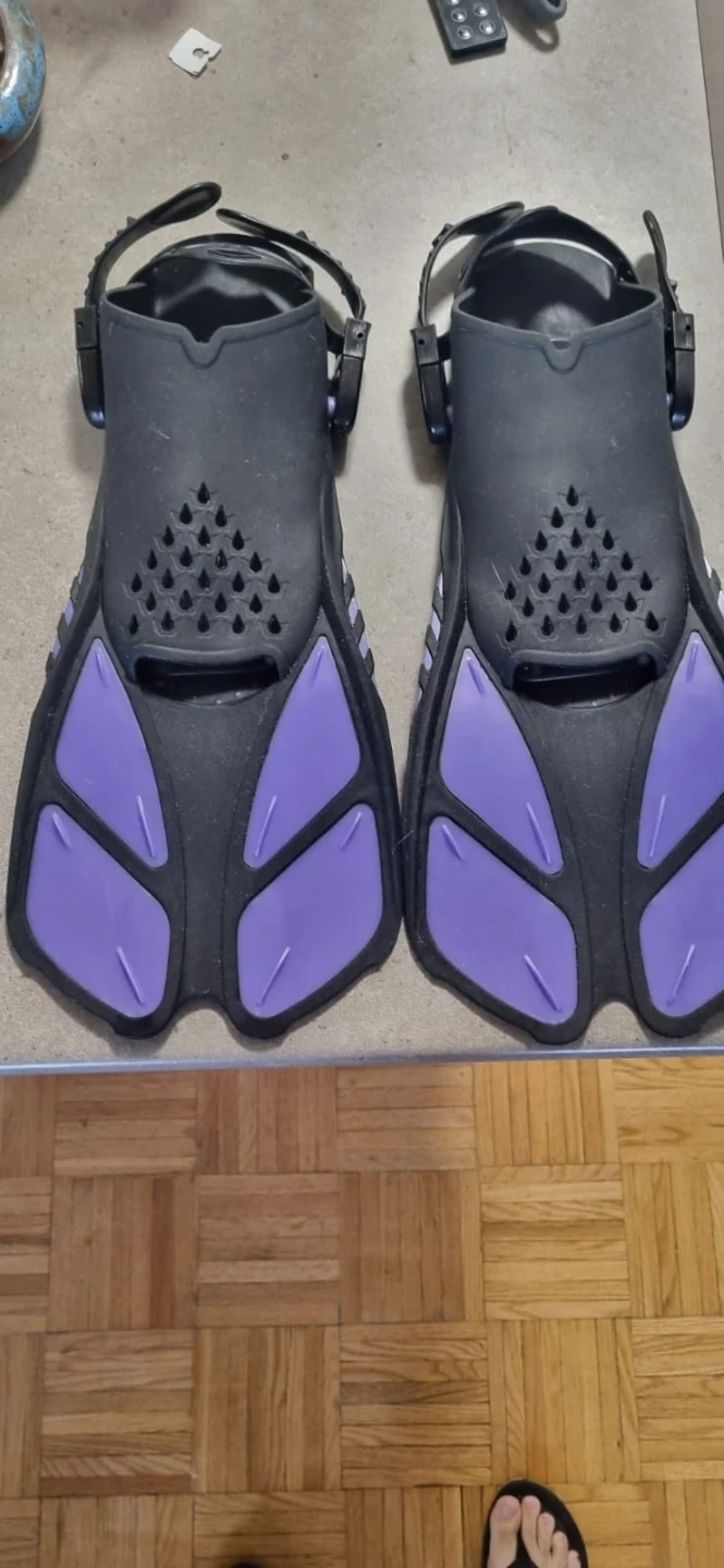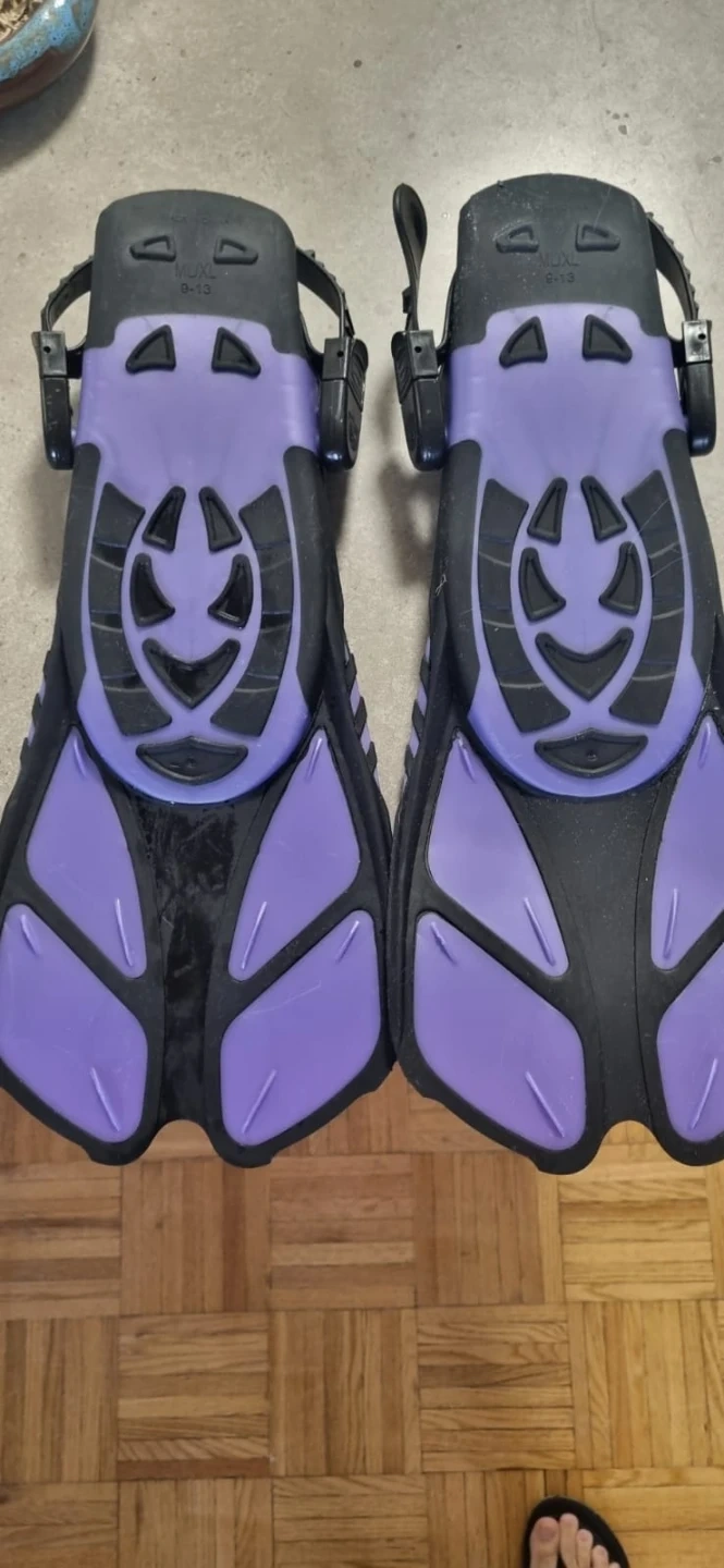 These adult snorkel fins are a vibrant purple and black. They come with a mesh carrying bag for easy transport. Adjustable straps ensure a snug fit for most adult shoe sizes.