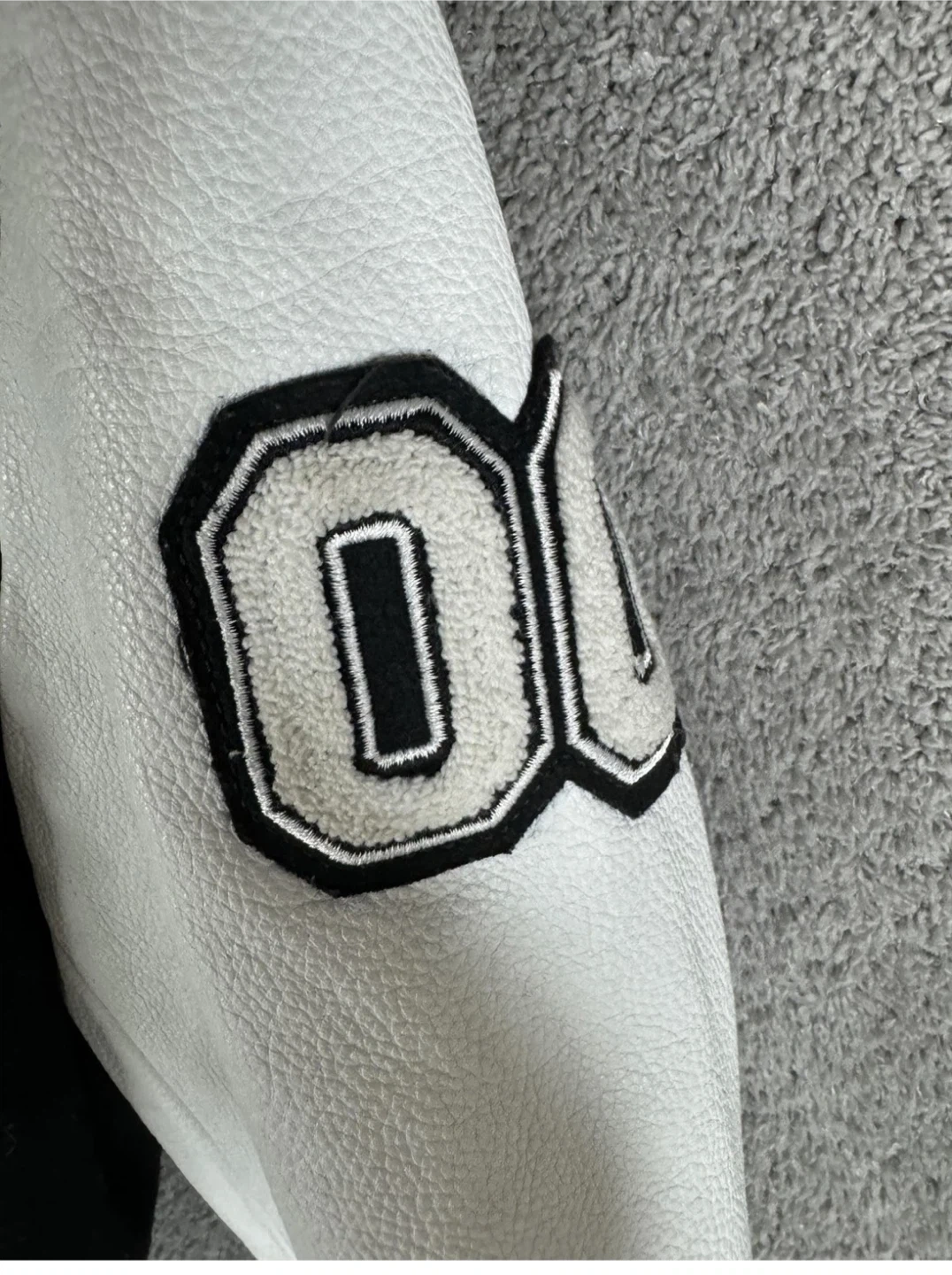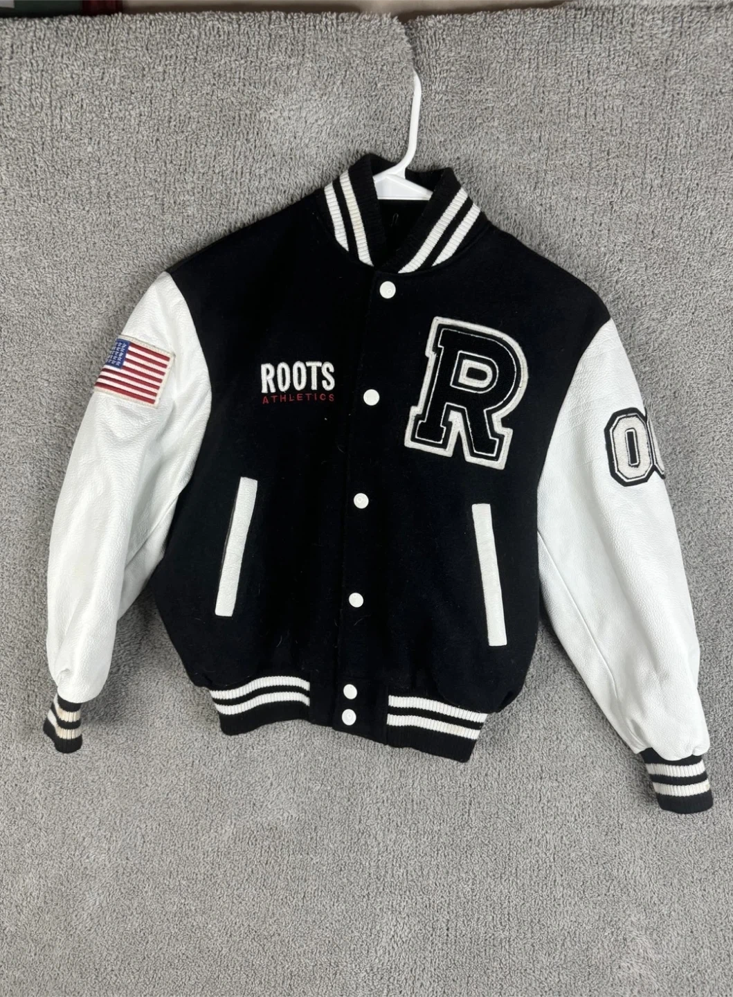 Black and white varsity jacket with "R" and "USA" embroidered on it. Features leather sleeves and ribbed cuffs and hem.size 4T/medium kids