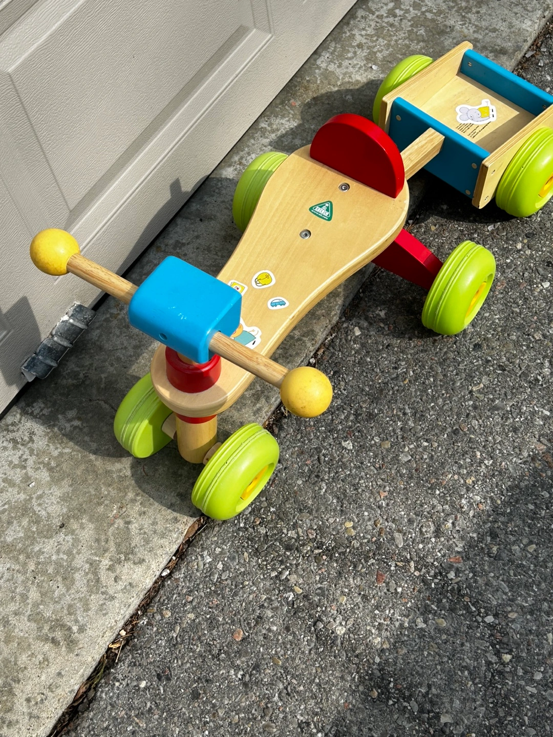 Adorable wooden ride-on toy. Features a detachable trailer. Bright colours and fun design. Great for toddlers. From Early Learning Centre. Pick up area Bayview and Sheppard