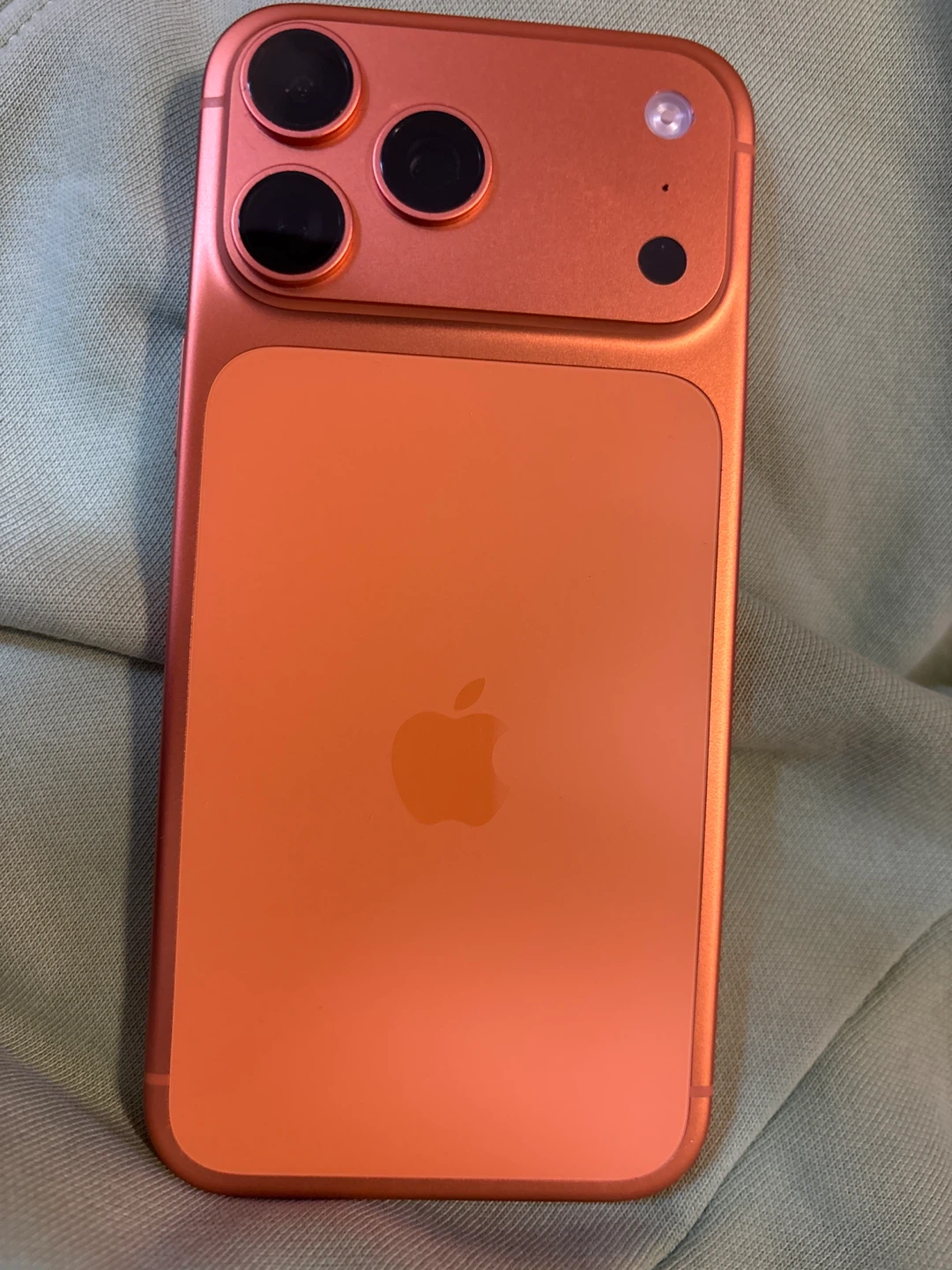 Selling an orange iPhone 17 Pro Max 256GB. Comes with a clear back with a MagSafe compatible design, CHARGER and box.