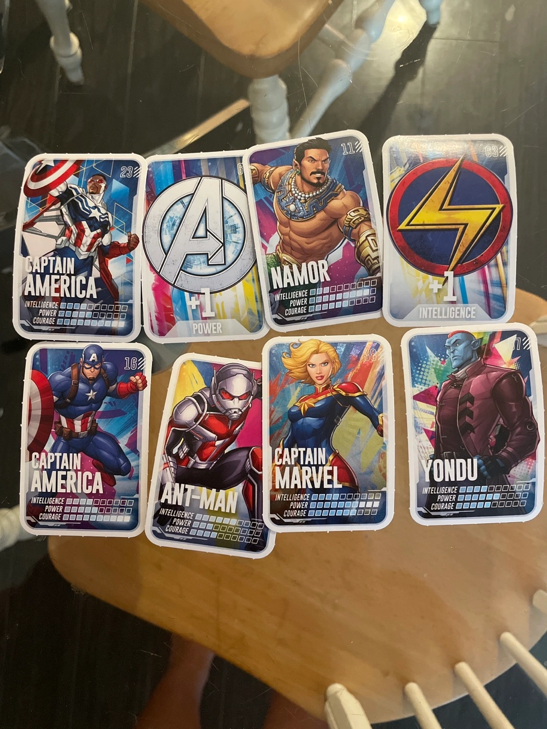 Set of collectible Marvel Avengers character cards. Features Captain America, Ant-Man, Captain Marvel, Namor, Yondu and a generic Avengers logo card. Great for collectors or fans.