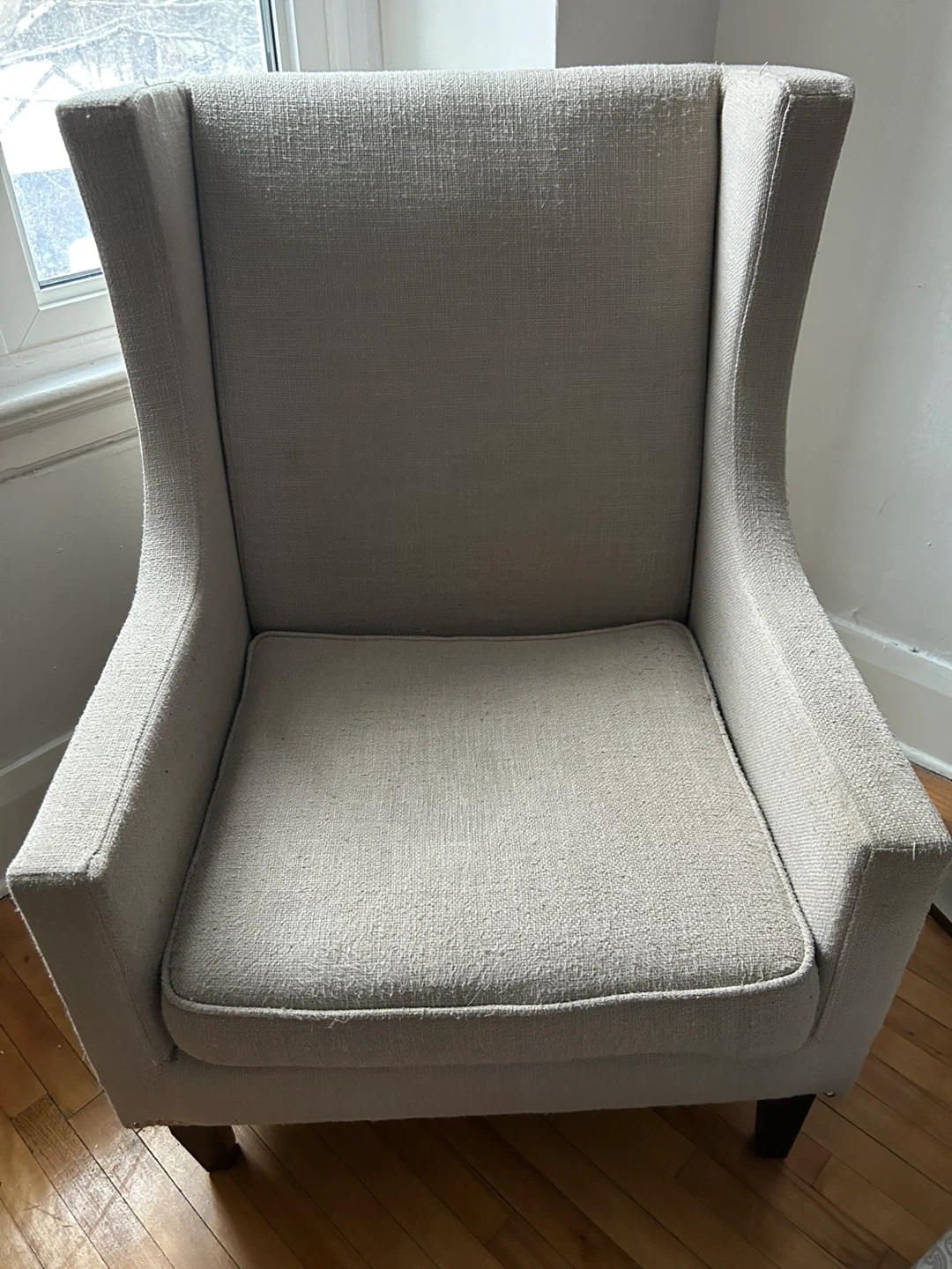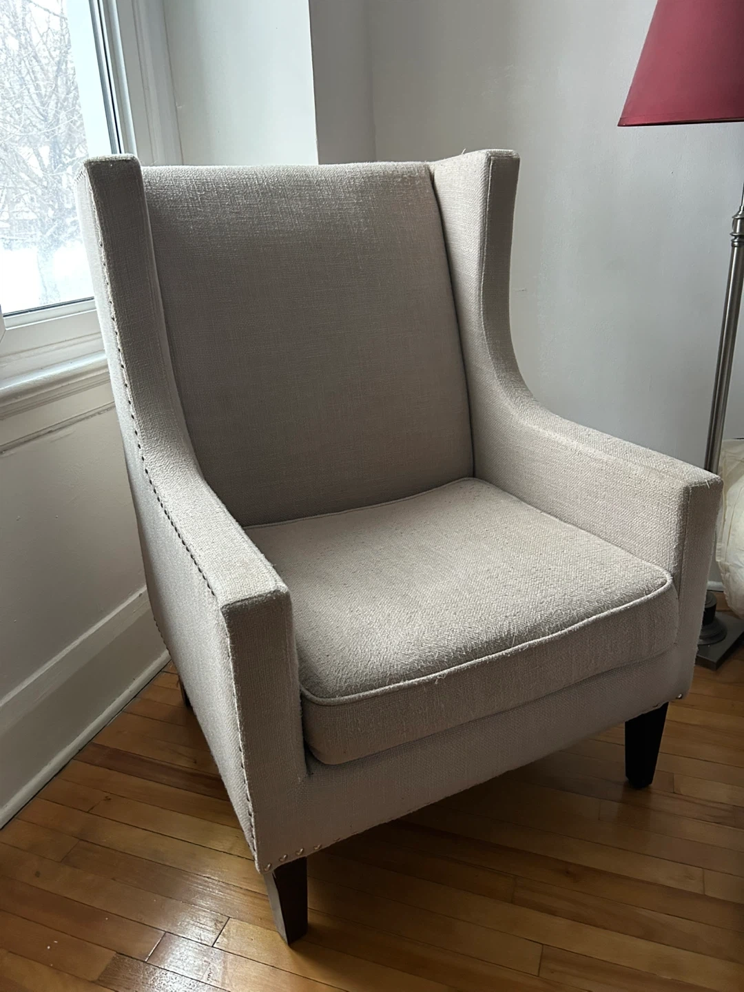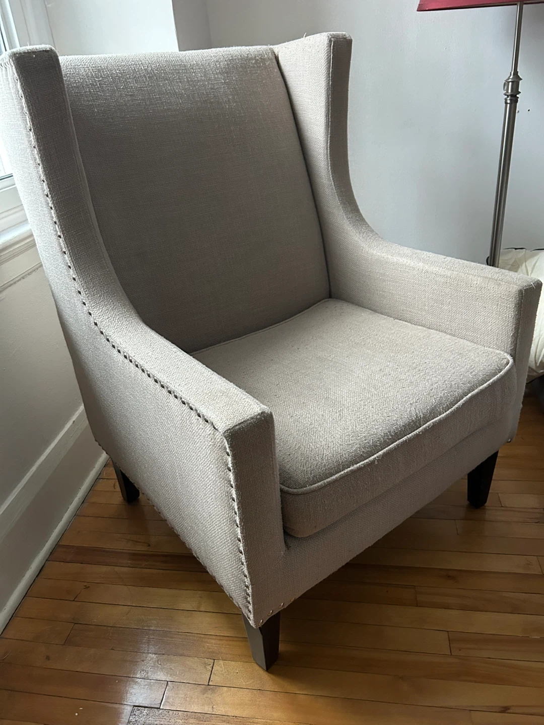 A comfortable accent chair with a neutral linen-like upholstery. It features decorative nailhead trim along the wings and arms. The chair has dark wooden legs.