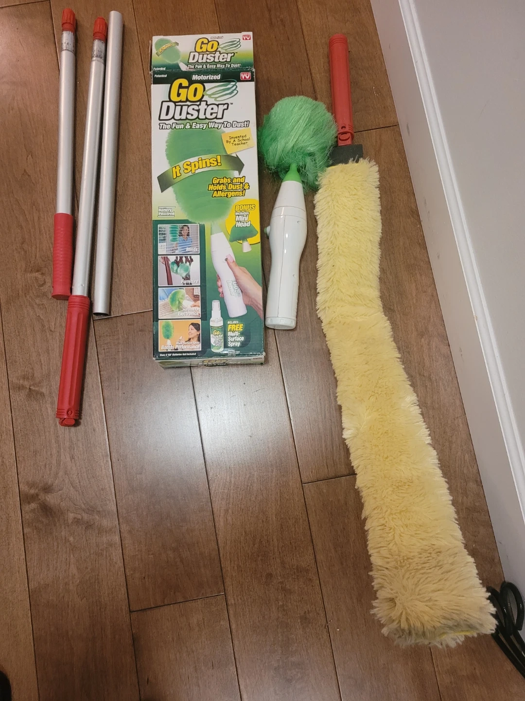 This motorized Go Duster spins to grab dust and allergens! It's battery powered and includes a mini head for smaller areas. Additional extension poles are also included.