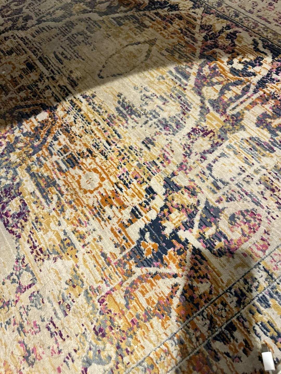 This area rug features a vibrant bohemian design with a mix of cream, navy, orange, and purple. Its textured surface adds depth and style to any room. Perfect for adding a pop of colour and pattern to your living space or bedroom!