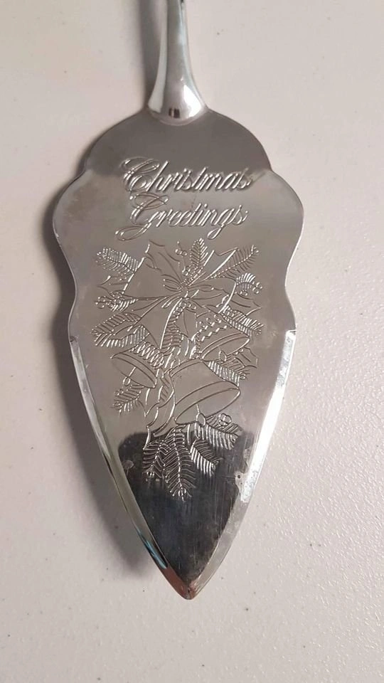 "Christmas Greetings" silverplate Dessert Server. Embossed with saying "Christmas Greetings" and Christmas bells. 12" long with a 6" lifting surface. Beautiful Seasonal piece. Smoke/pet free home. Pick up west end of Peterborough $5